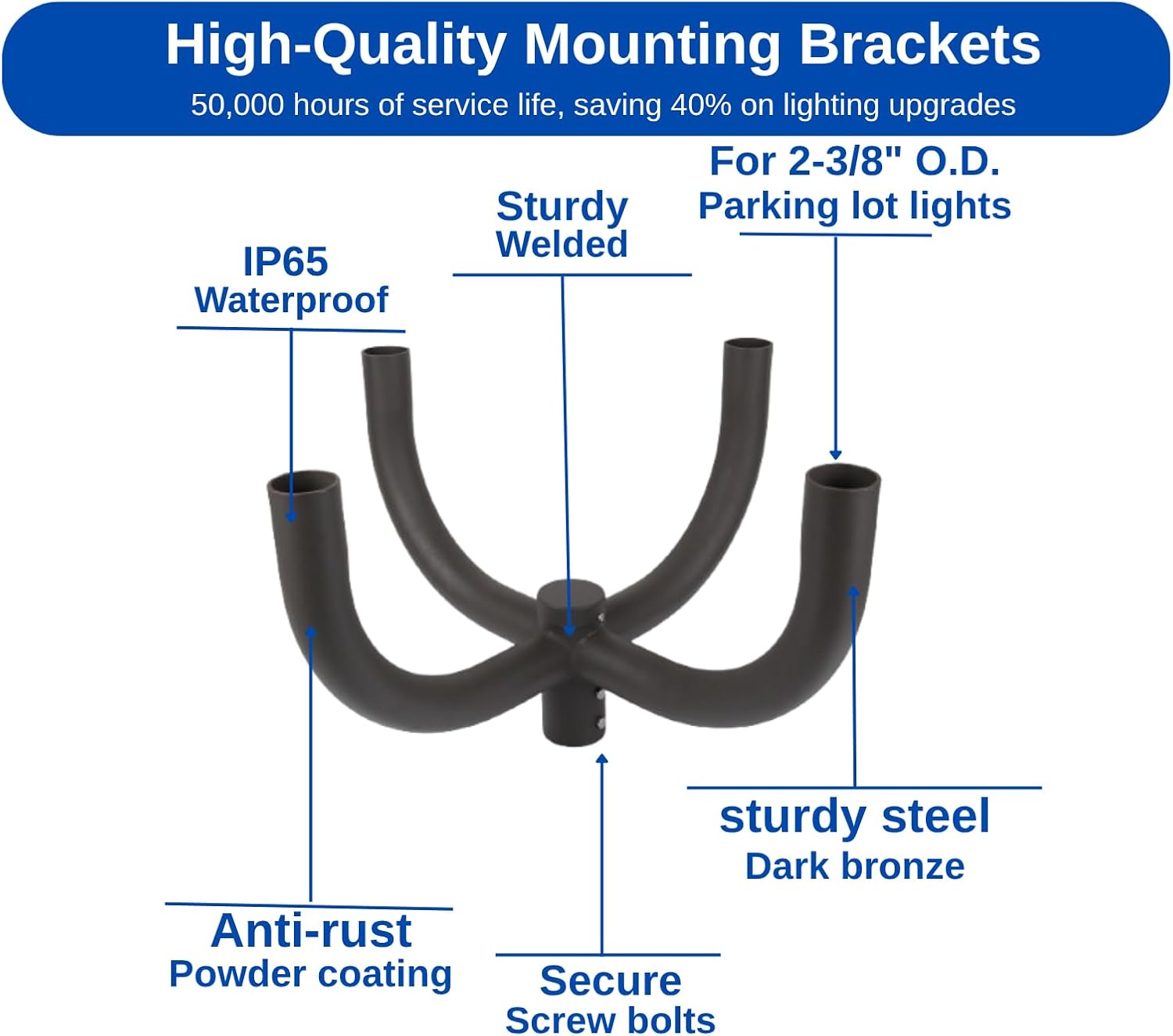 2-3/8-in Round Bullhorn Tenon: Specifically designed for standard slip fitter fixture with an outer diameter of 2-3/8 in. Mounting bracket tenon perfectly fits mainstream heavy-duty LED parking lot lights, shoebox lights, high-mast pole area lights, and outdoor streetlights available on the market (please confirm the size of your fixture before installation)