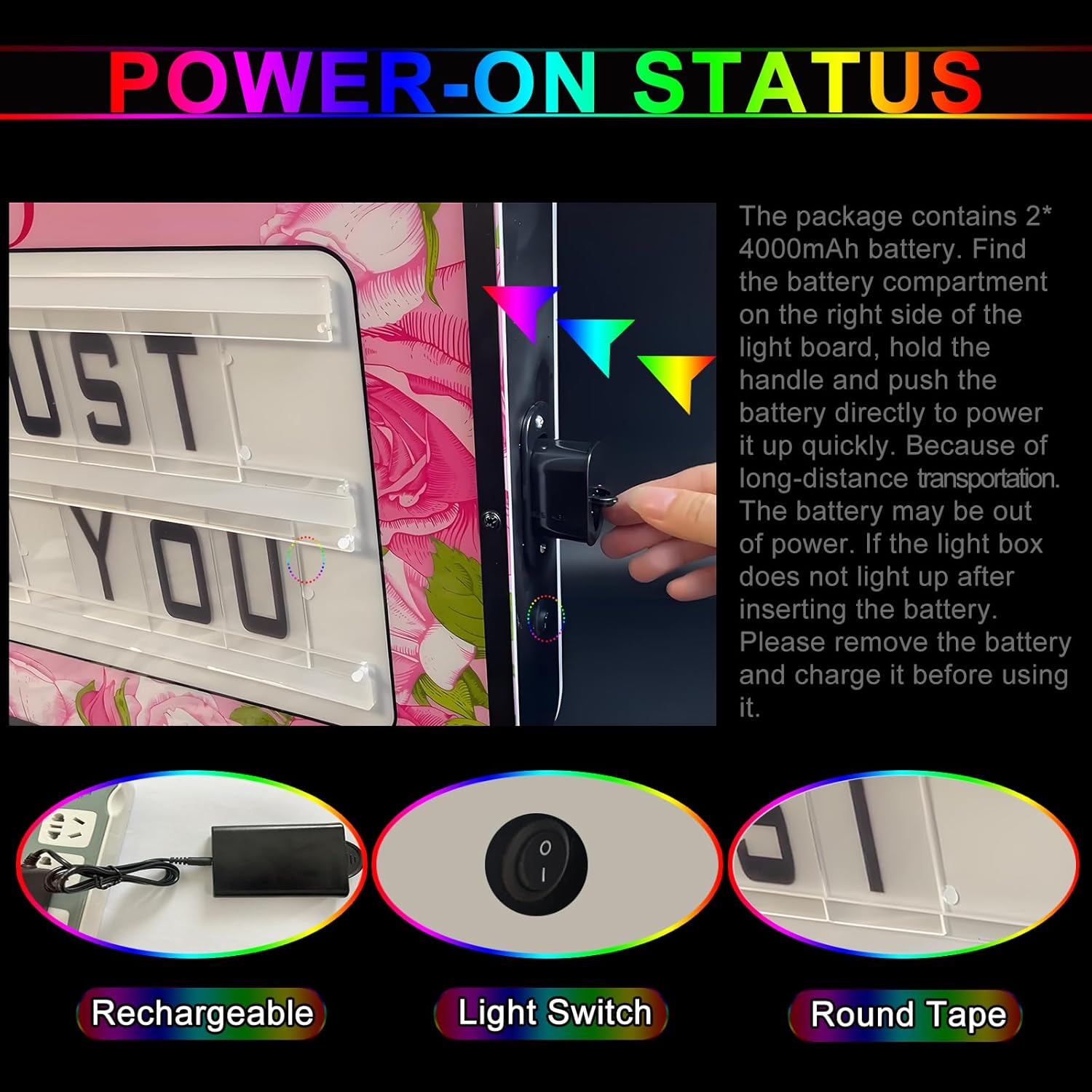 LIGHT SIGN IS VERY CONVENIENT TO USE- The color changing light box uses a 4000mAh*2 rechargeable battery (removable). It can be used for about 3-4 hours after charging for 6 hours. Slide the letter cards into the light box slots and quickly decorate your Wedding Party, Light shows, Christmas tree, family gatherings, flower car parades, sweater parties, or cookie parties.