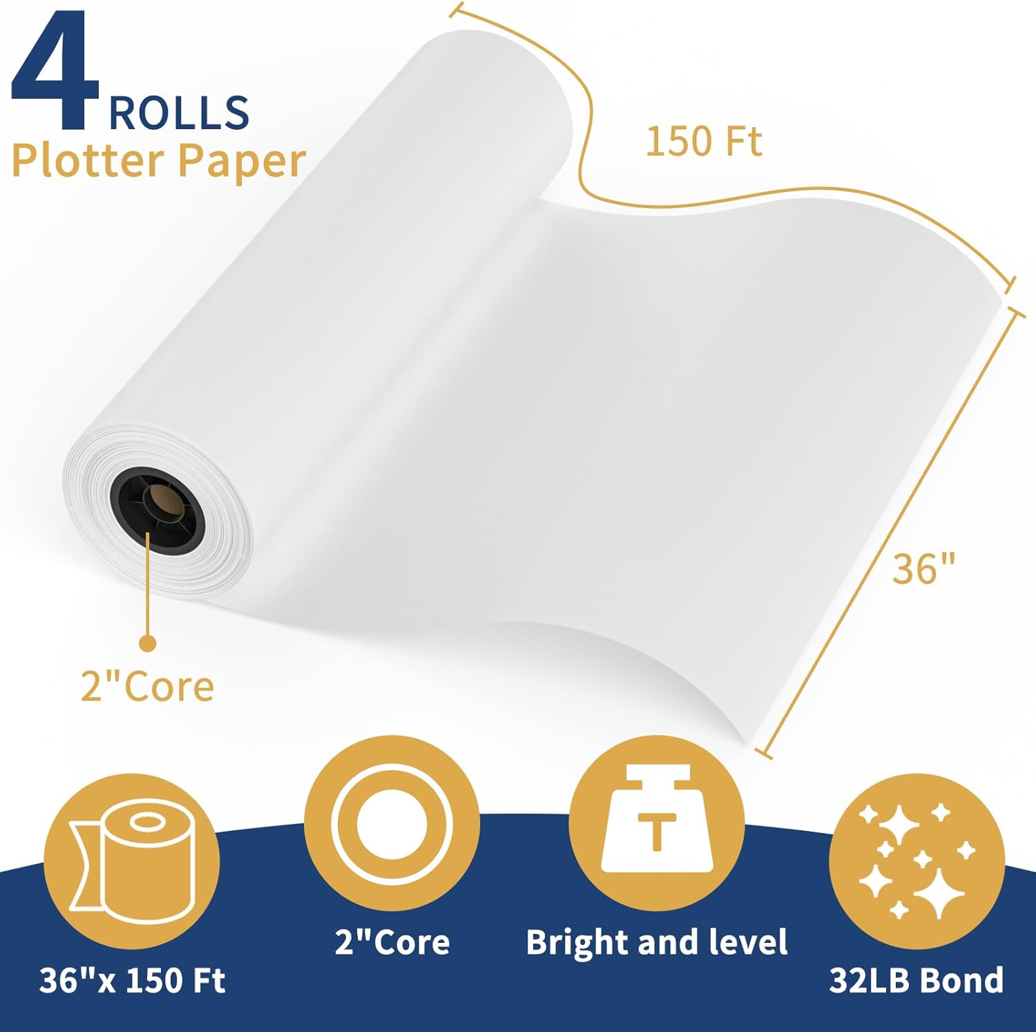 Perfect Size & CompatibilityEach 36\' x 150` plotter paper roll features a standard 2\' core that fits all wide-format inkjet plotters and printers. The generous length ensures long-lasting use, reducing the frequency of roll changes and improving workflow efficiency.