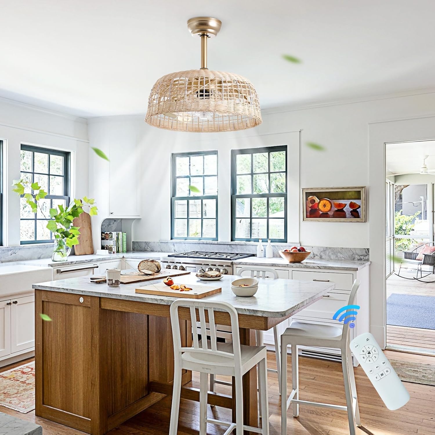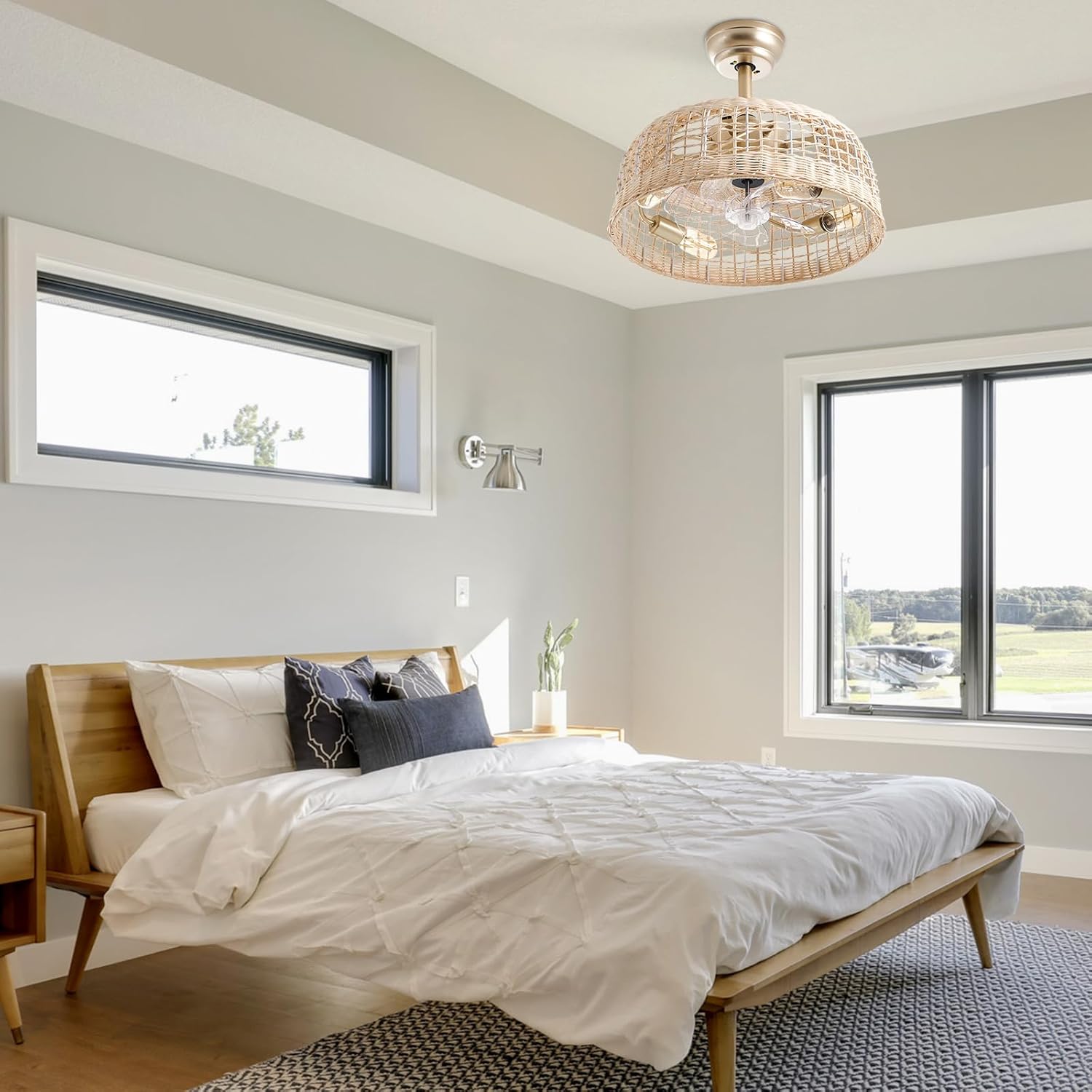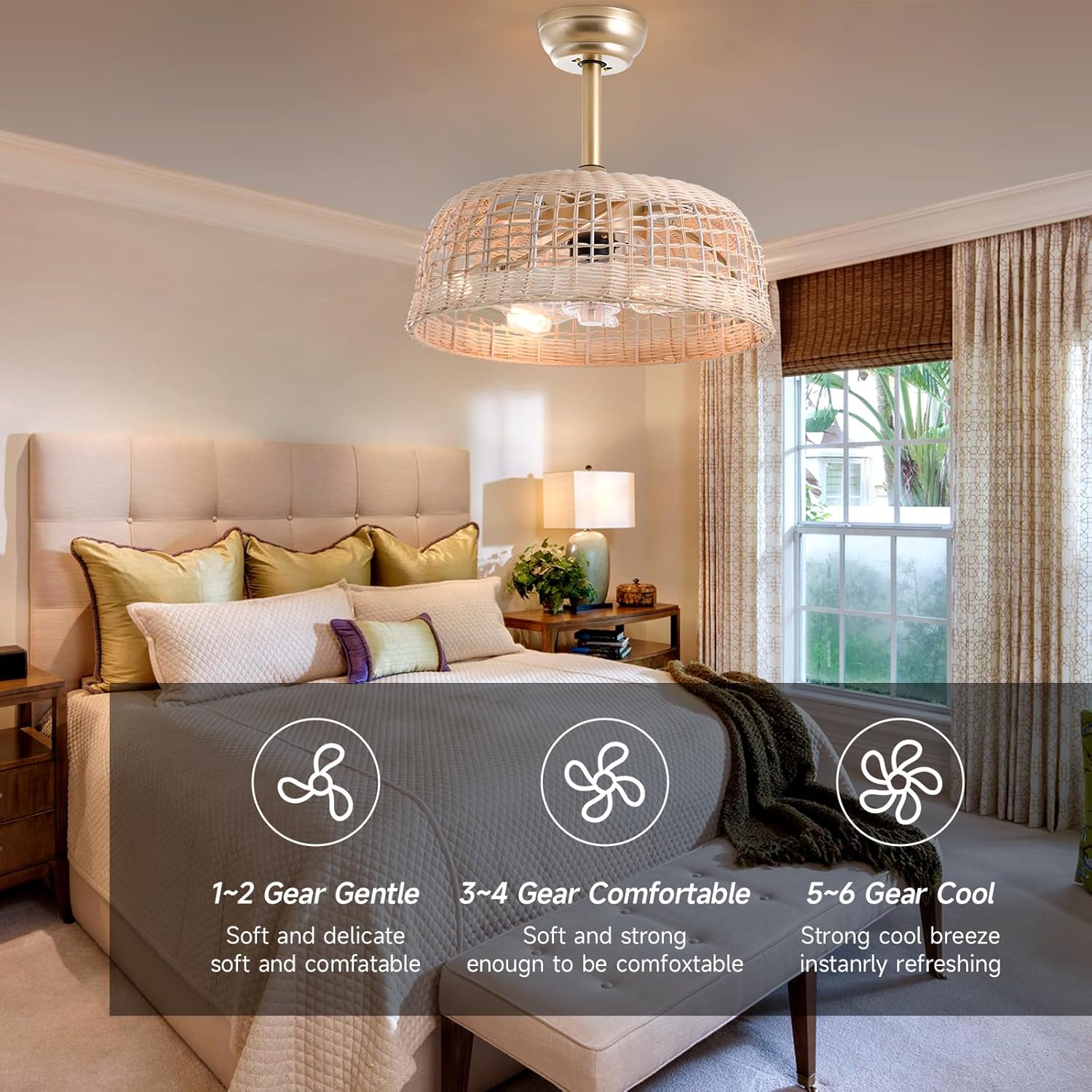 Ceiling Fans with Light 18.9in Wicker Fandelier Cage for Bedroom, Living Room, w/ Remote Control 6 Speeds