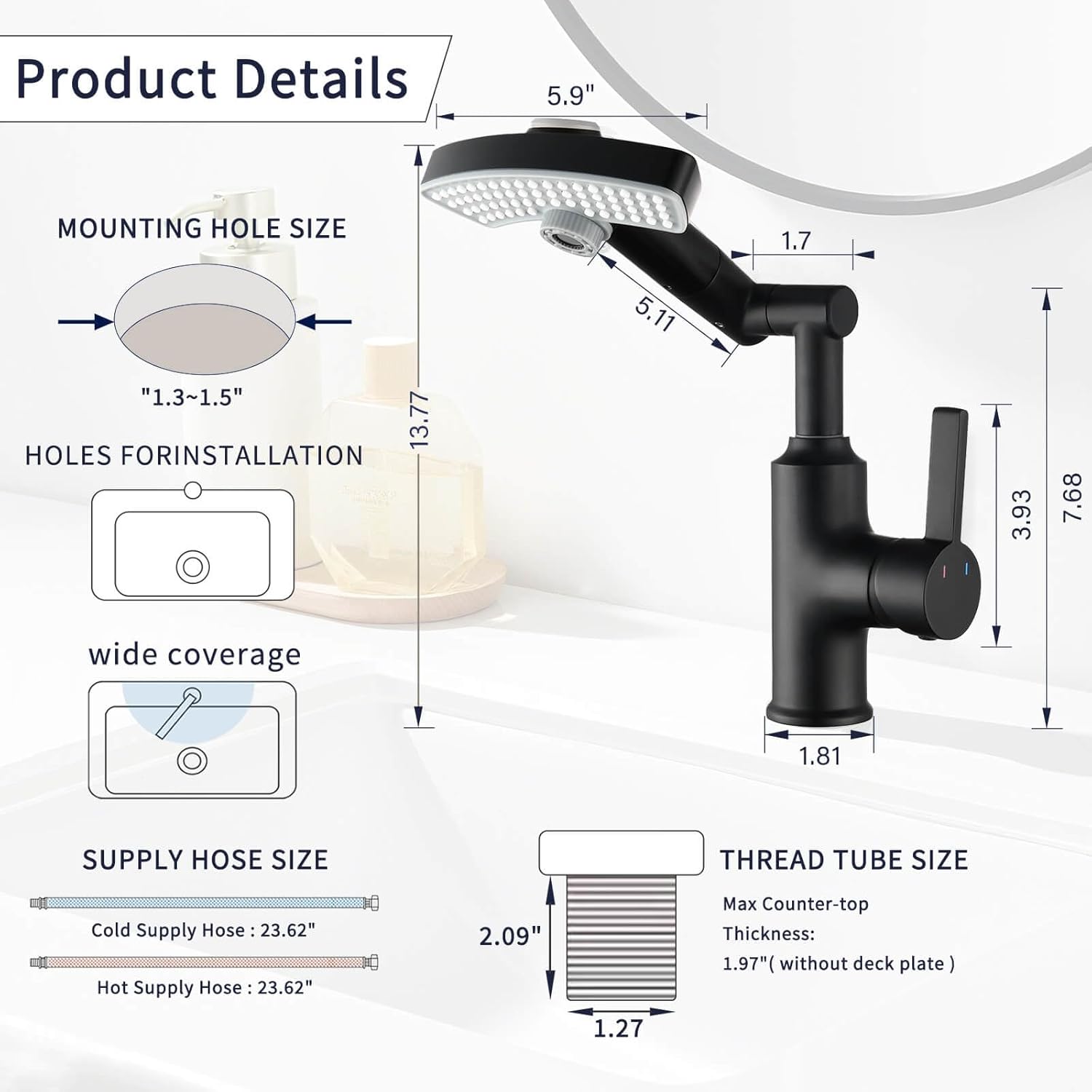 Black Rainfall Bathroom Faucet, 360 Rotatable Faucet, Single Handle with LED Temperature Display(No Batteries), 3 Water Modes