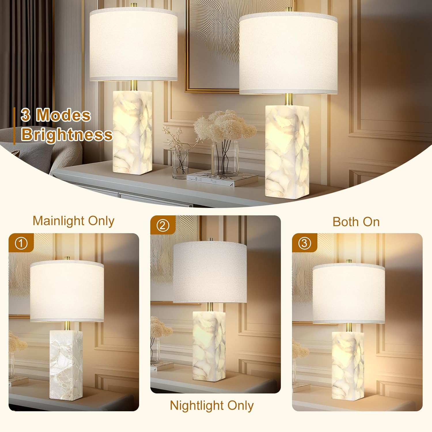 Natural Alabaster Table Lamps, Set of 2 w/ Night Light for Bedroom Living Room, 23' Rotary Switch, Dimming