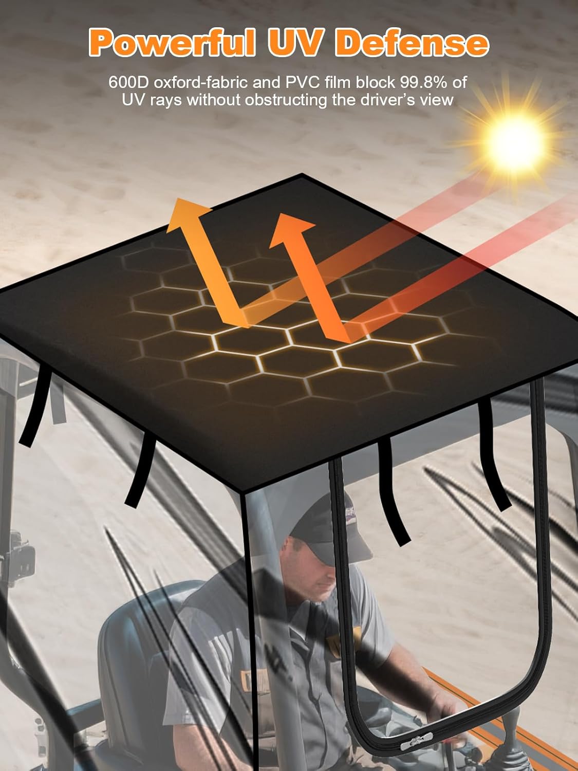 Anti-UV & Clear Visibility Protection: Crafted from PVC film with a 600D Oxford-fabric roof, this enclosure blocks up to 99.8% of UV while providing a crystal-clear view. It resists wrinkles and ensures long-lasting clarity, safeguarding your operator from harsh sun without compromising visibility
