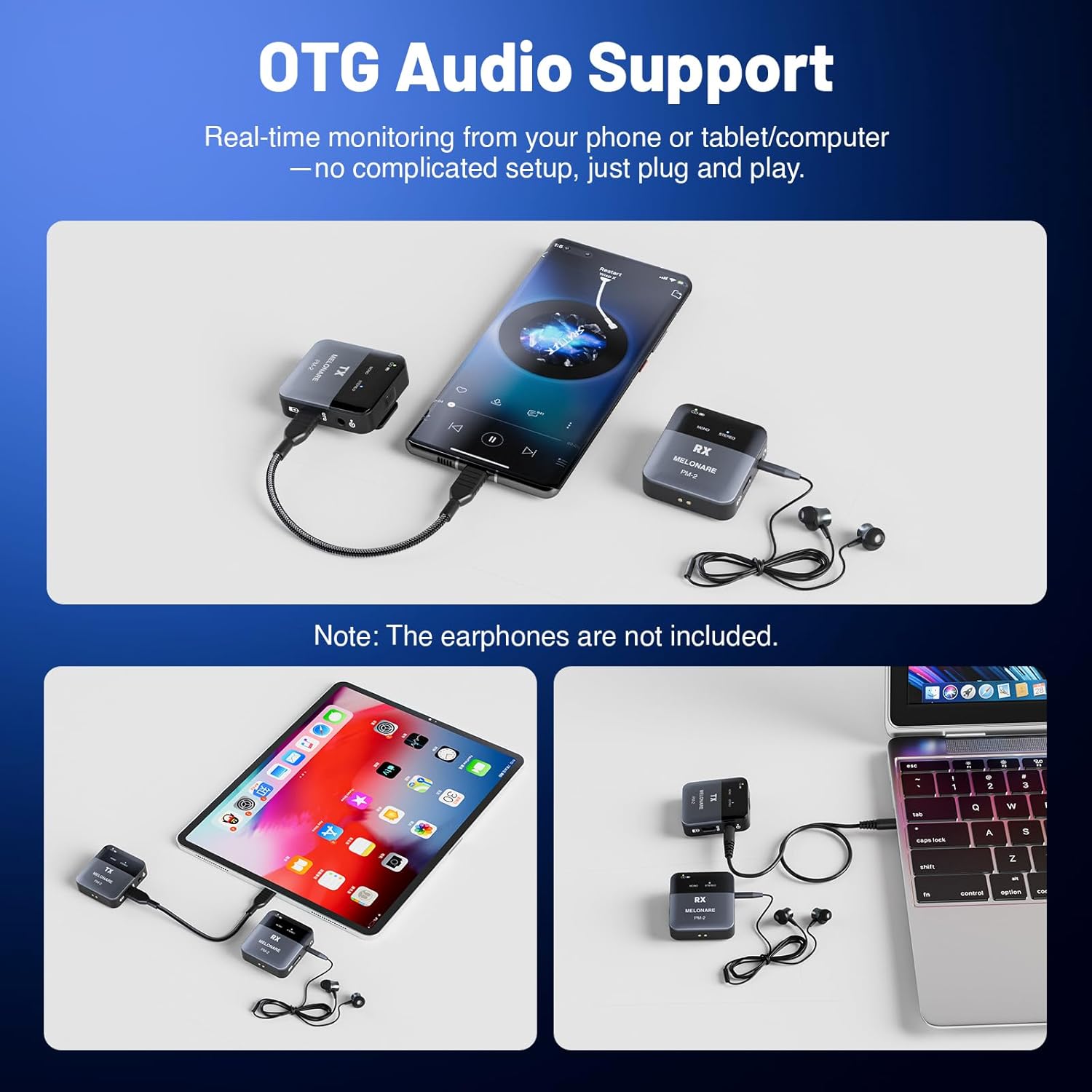 OTG Audio Input Support: Easily connect the wireless IEM system to smartphones, tablets, and laptops using the included OTG cable—even devices without a headphone jack. This setup enables real-time in-ear monitoring for musicians, hosts, and performers while eliminating complex wiring—ideal for quick setups and mobile use