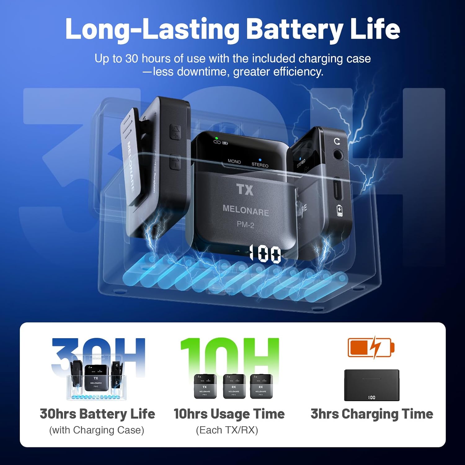 Up to 30 Hours of Battery Life: Each full charge powers both the transmitter and receiver for up to 10 hours of continuous use. The included 2000mAh charging case for the in ear monitor system offers two additional full recharges, extending total runtime to 30 hours. This means less downtime and greater efficiency, ensuring smooth, uninterrupted wireless monitoring wherever you are
