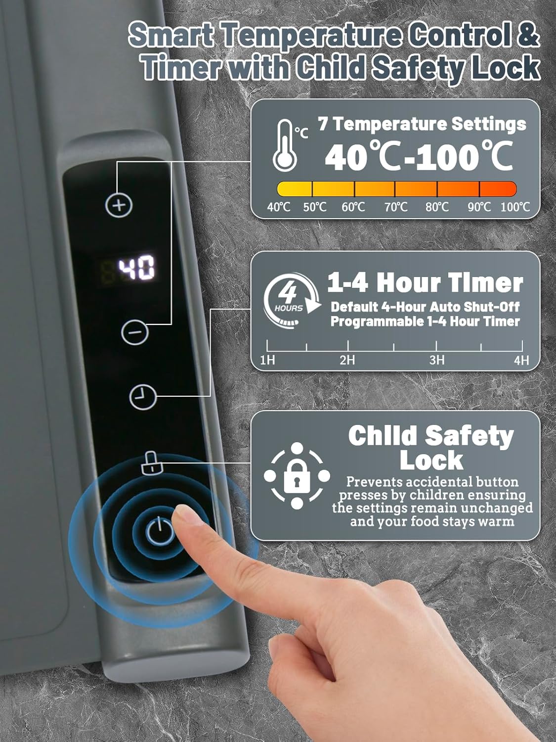 Enhanced Safety FeaturesPrioritizing your family`s safety, our food warmer includes a baby safety lock that secures the control panel, preventing little hands from changing settings. With an automatic shut-off after 4 hours, you can relax knowing it won`t overheat if you forget to turn it off. Enjoy peace of mind with our mat, designed to operate safely around children while minimizing risks.