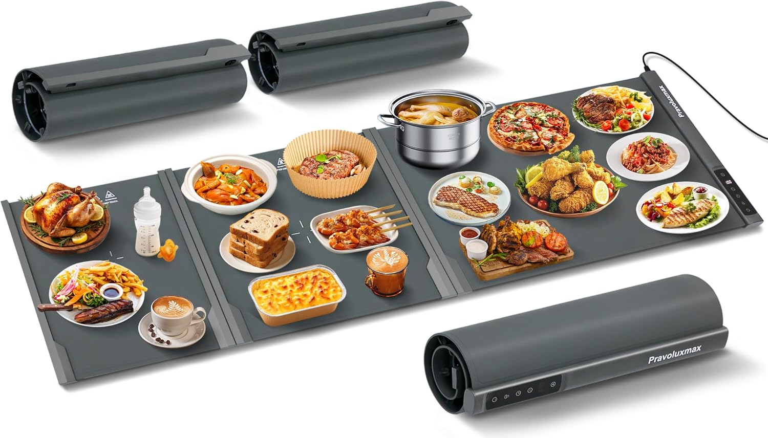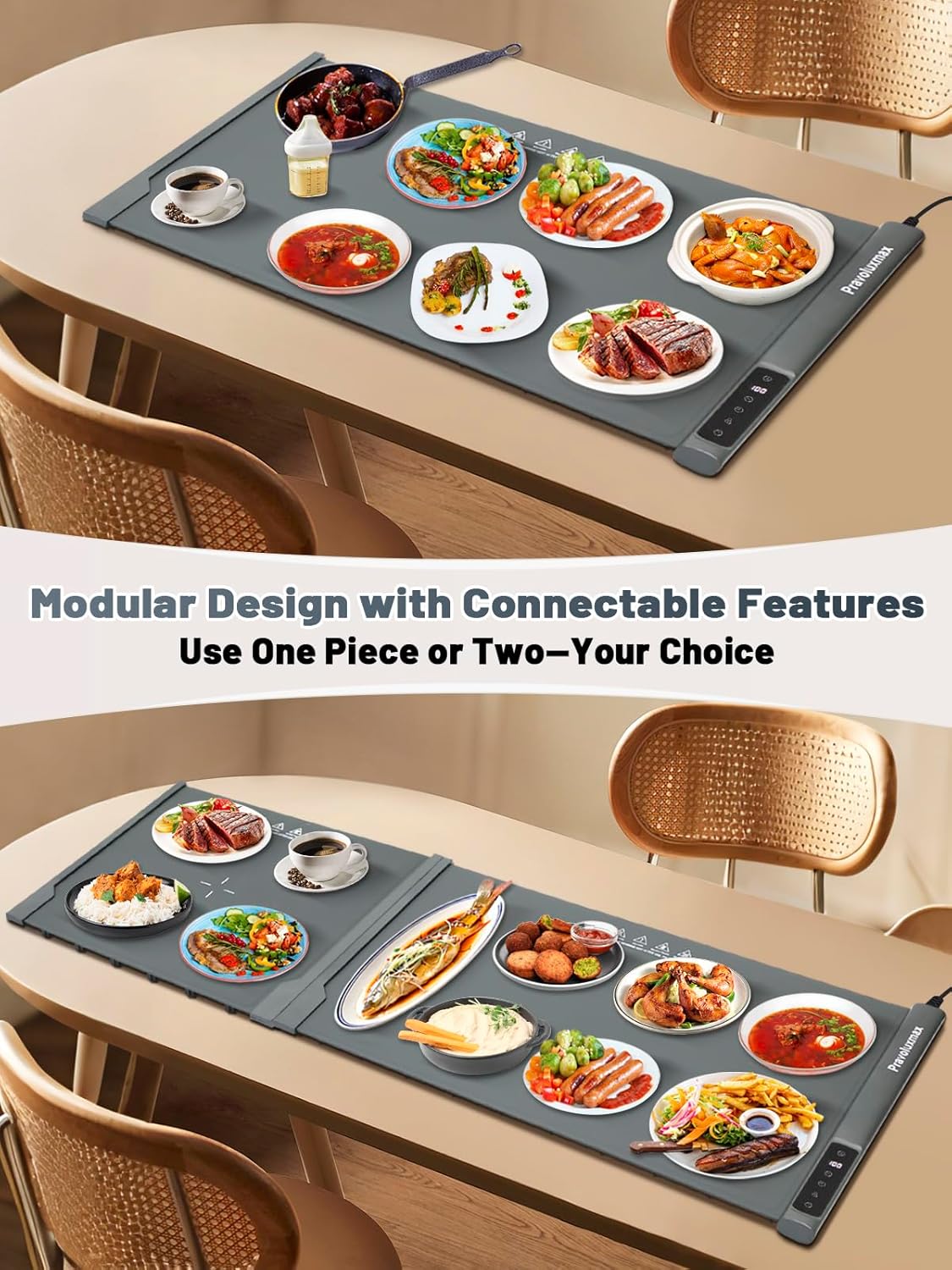 54\' Extra Large Food WarmerTransform your gatherings with the Pravoluxmax food warming mat! Featuring a unique three-piece design that expands to a generous 54\' x 16\', this mat allows you to keep multiple dishes warm at once, ensuring your food is warm and inviting. Make every meal a cherished occasion with friends and family for gatherings of 10 or more people—perfect for parties and buffets. For daily use, you can easily switch to single or two-piece configurations: 25\' x 16\' for one piece, or 41.5\' x 16\' and 37.5\' x 16\' for two pieces.