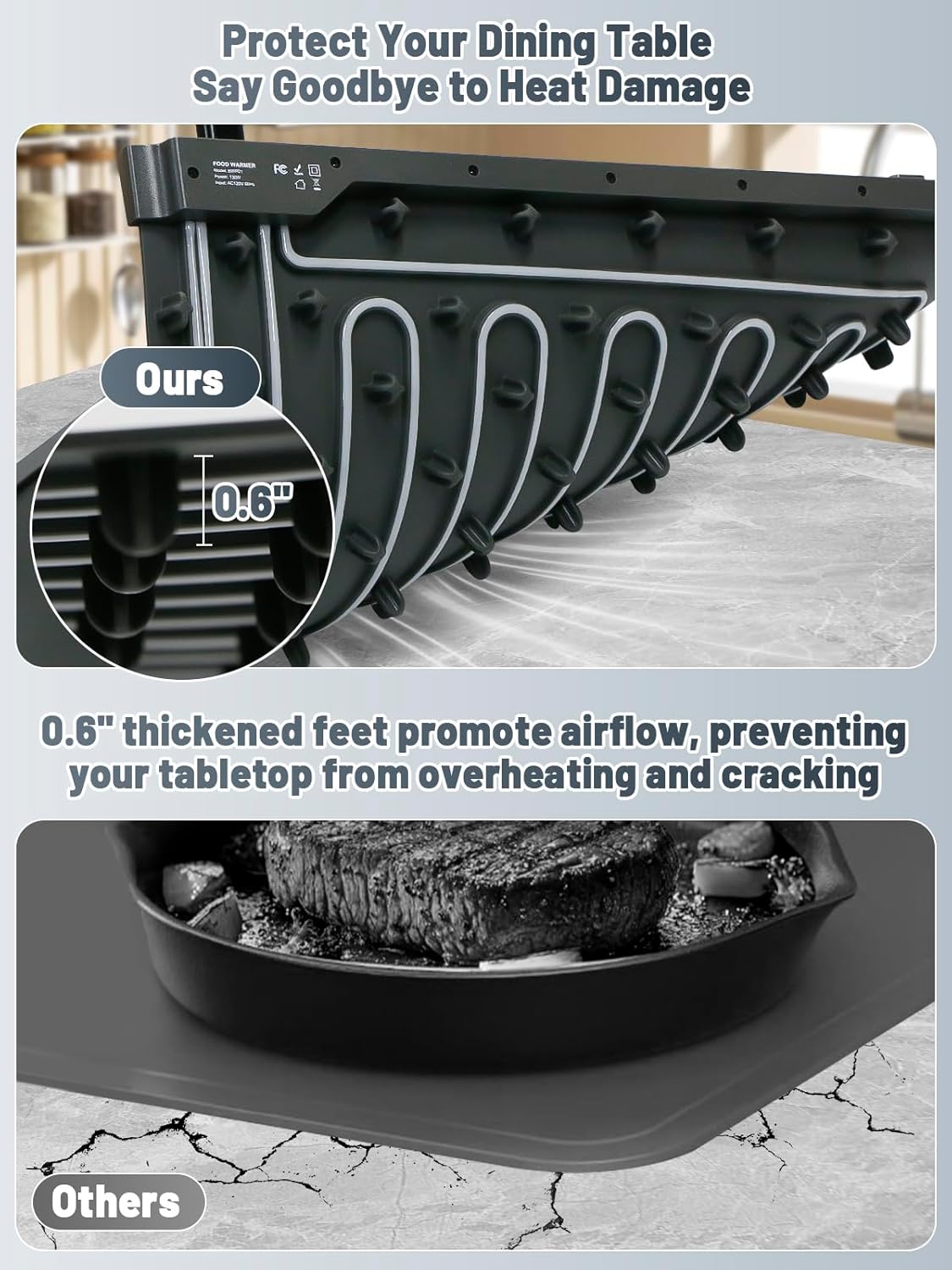 Table Protection DesignOur food warming mat features supportive feet that elevate the heating wires 0.6 inches above your tabletop, promoting airflow and preventing overheating that could damage your surfaces. The non-slip design ensures it stays securely in place, protecting your beloved dining table from scratches. Enjoy the peace of mind that comes with both functionality and protection, allowing you to serve meals without worry while keeping your table safe and looking great.