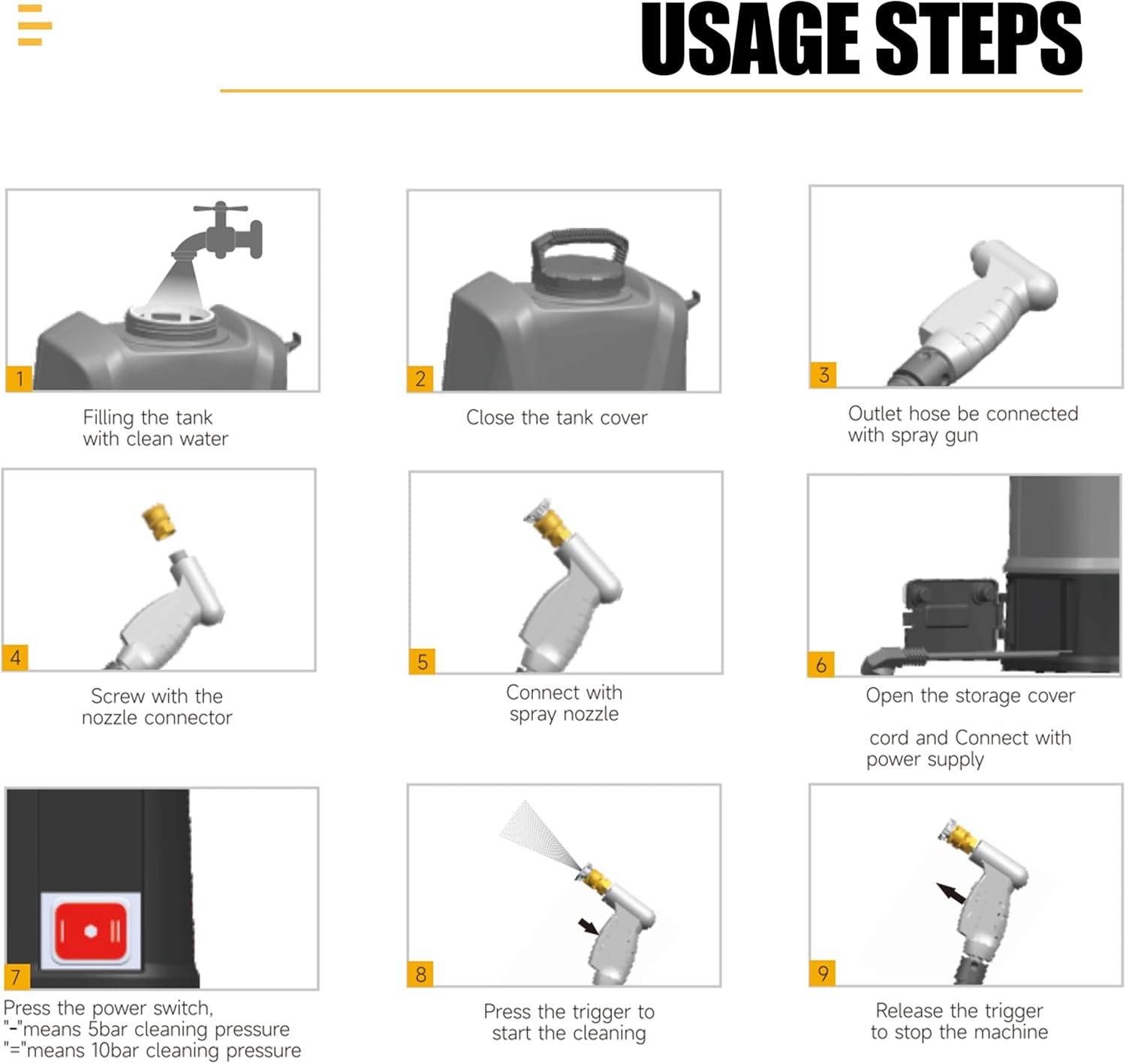 Compact yet Sturdy: The sturdy casing and lightweight design make this device perfect for tough environments and prolonged use. It can be used effectively both at home and for mobile cleaning tasks while traveling. An integrated storage compartment allows you to store all attachments safely and within easy reach. These attachments include durable quick-connect hoses, a wand, and a trigger sprayer.