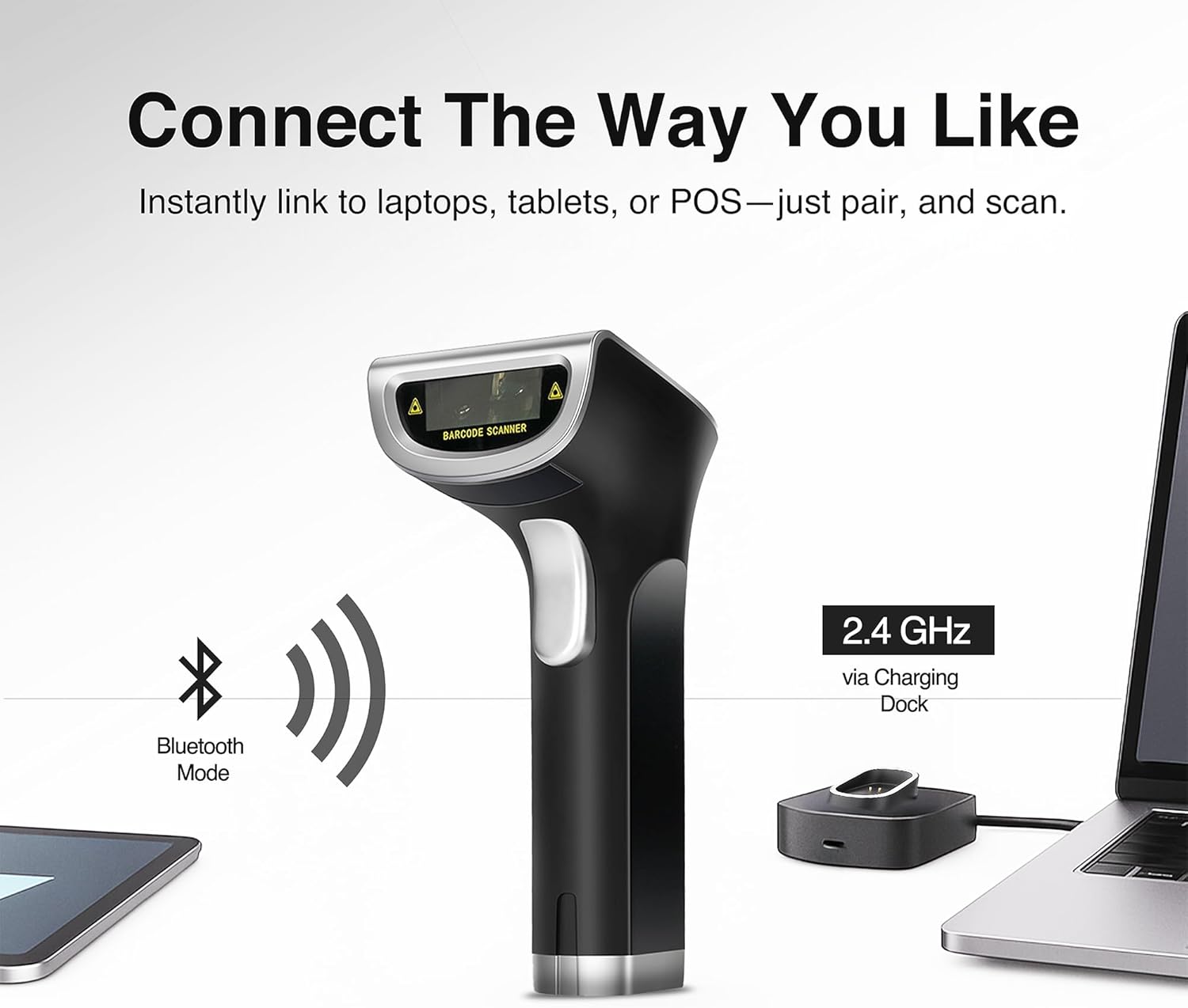 SMART WIRELESS FLEXIBILITY: Two options: Bluetooth barcode scanner for iOS, Android, macOS, Windows, and Linux, or 2.4 GHz wireless via the charging stand, which connects to your computer with a USB cable.
