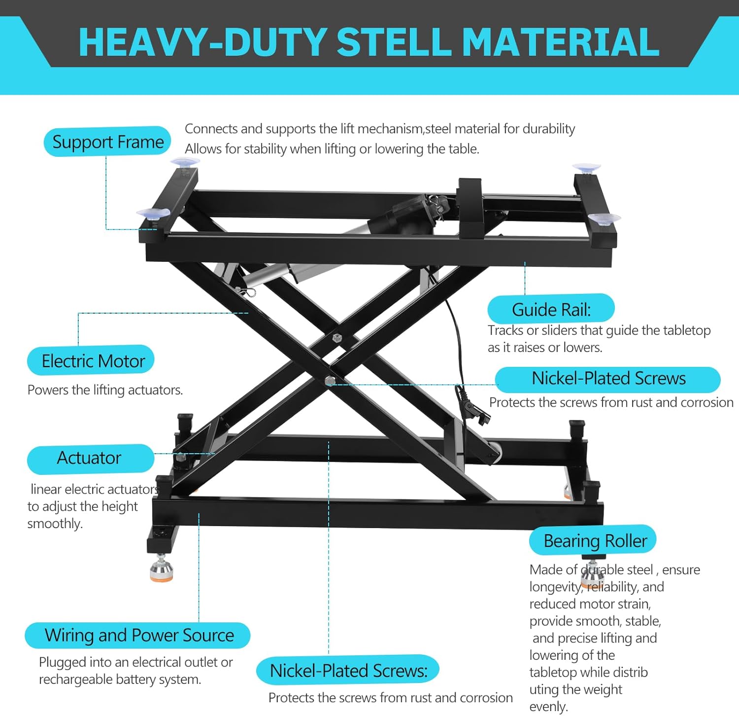 Heavy-duty Load Capacity: Electric lift table made of high-quality powder-coated steel, rust-proof and corrosion-resistant, and features a spacious 30 x 16-inch desktop for a variety of items. The maximum load capacity of 330 lbs and support adjustable height from 7.5inch to 29.5inch, this electric lift table allows you to safely and easily perform lifting and transport tasks at different heights