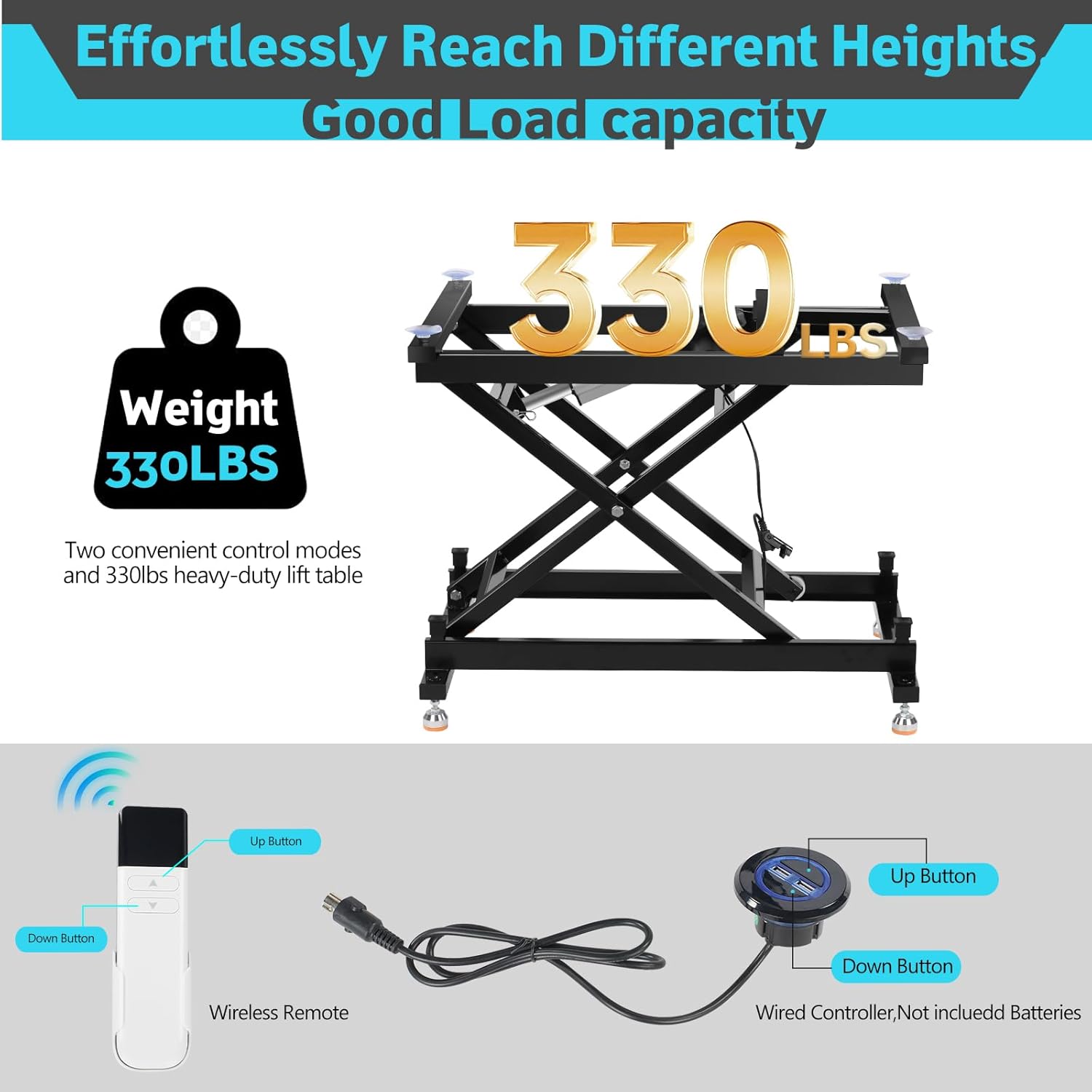 Two Control ways: Easy to operate our single scissor lift provided 2ways for control the device, wireless remote or wired controller not include batteries, you can insert power for working, Which Effortlessly reach your table to different heights you want. The wireless remote with range limited of 10 meters, so you can control the table within this distance. Perfect for matching with different tabletops or accessories, customizable as a tatami table, coffee table, a photography stand or a laboratory lift