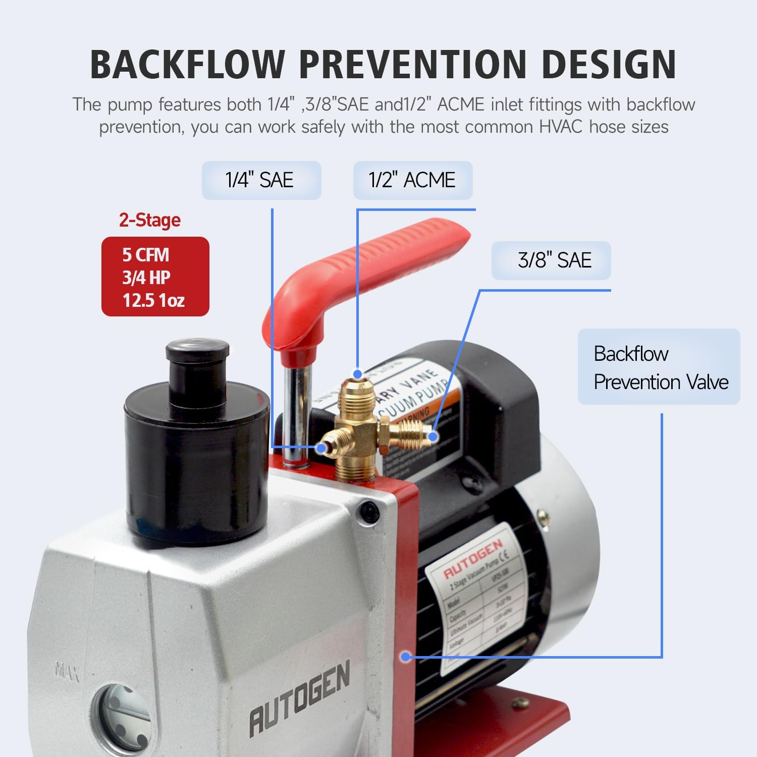 Rotary Vane Vacuum PumpIntake Ports: 1/4\' flare, 1/2\' ACME, 3/8\' SAE, Free Air Displacement(FAD): 5CFM, Power: 3/4HP, Voltage/Frequency: 110/60HZ, Ultimate Vacuum: 0.3 PA, Oil Capacity: 14.48oz, Non-Slip Cushion Handle.
