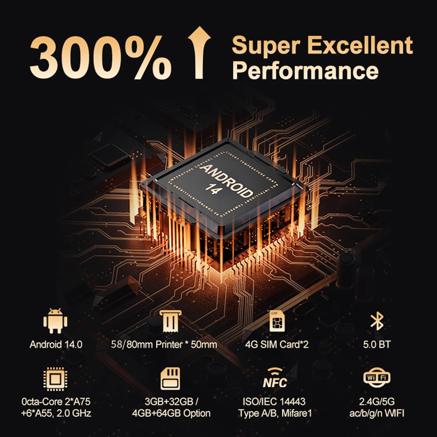 Android 14 System 3GB+32GB Memory,Versatile connectivity with dual-band Wi-Fi (5G), Bluetooth, and SIM support: Stay connected at all times with dual-band Wi-Fi (5G) connectivity for a stable and fast internet connection, Bluetooth 3.0/4.2/5.3 BLE for connecting peripherals, and support for standard SIM cards for reliable mobile connectivity anywhere. This comprehensive connectivity ensures that your business remains operational even on the go.