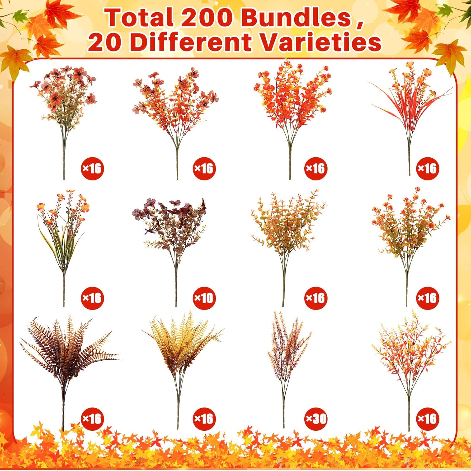 Realistic Artificial Flowers: You will receive 200 pieces of 10 styles of artificial fall flowers for outdoors, including eucalyptus, five-ear plum, wheat sheaf, lavender and Persian fern in various colors. With realistic look, they closely mimic the look of real blooms, from the delicate petal shapes to the natural color. With 200 pcs in a set, you have ample modern flowers to Immerse your space in the beauty of nature with these artificial fake flowers now