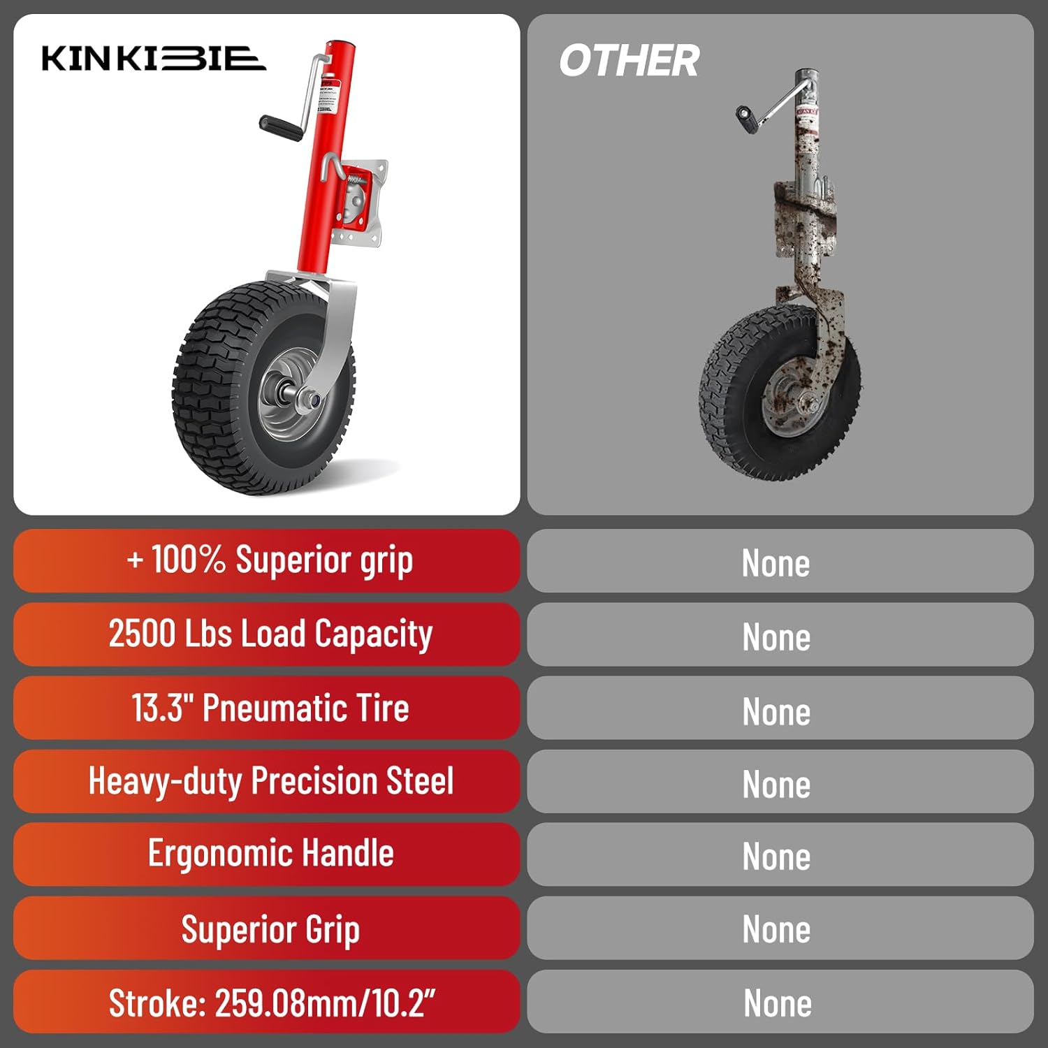 2.Durable and Safe:The construction of the Beach Boat trailer jack is Heavy-duty Precision Steel with a zinc coated surface which makes them durable, strong and long lasting. Each Boat trailer jack has a break strength of 2500 pounds and a safe working load limit of 2000 pounds.Boat trailer jack has 10.2\' Lift with Dual 13.3\' pneumatic tire