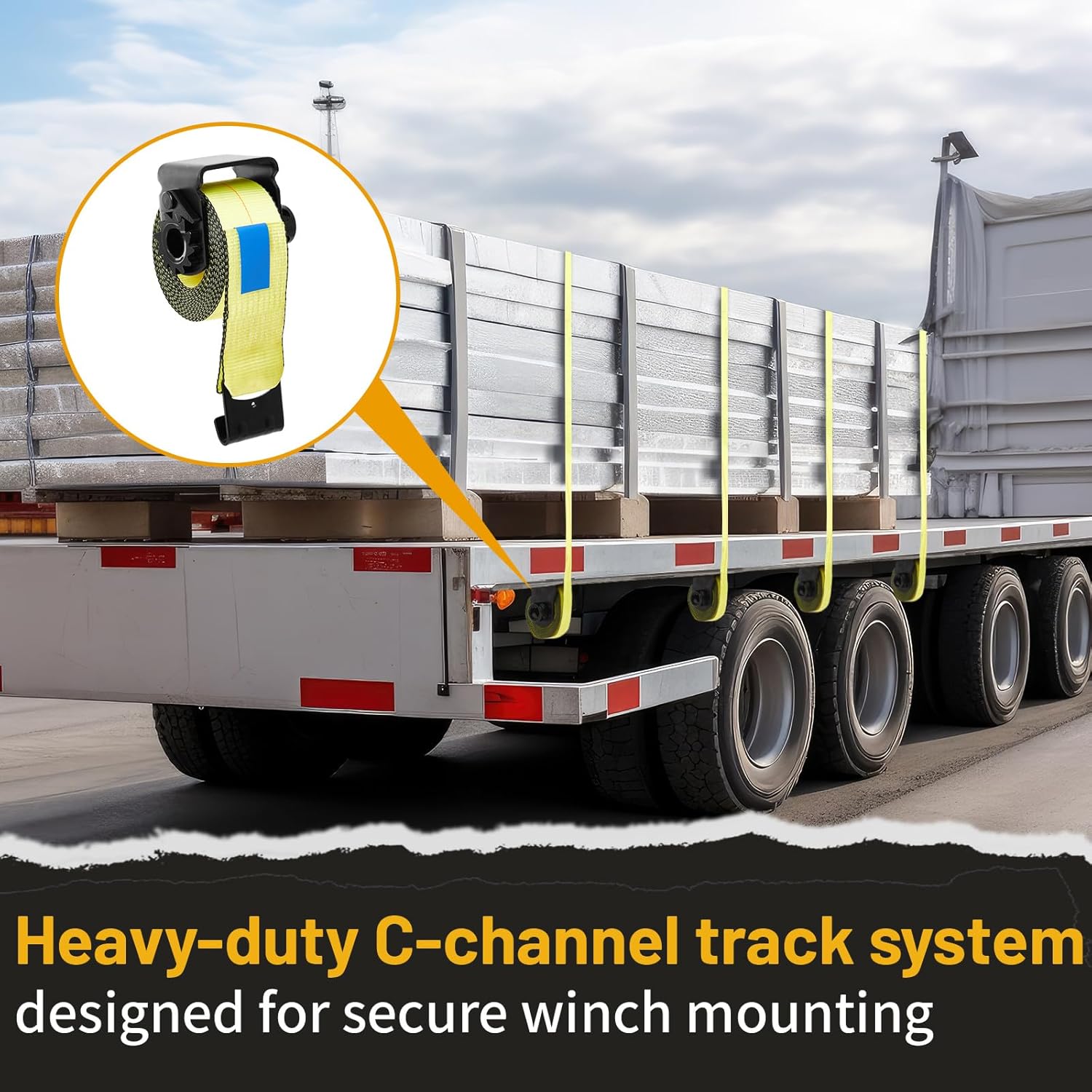 Product Advantages: Flatbed equipment accessories allow you to precisely position the flatbed straps. Simply slide the winch along the winch track in any direction until it aligns with the load to secure it. Applying tension to the tie down straps locks the winch into place