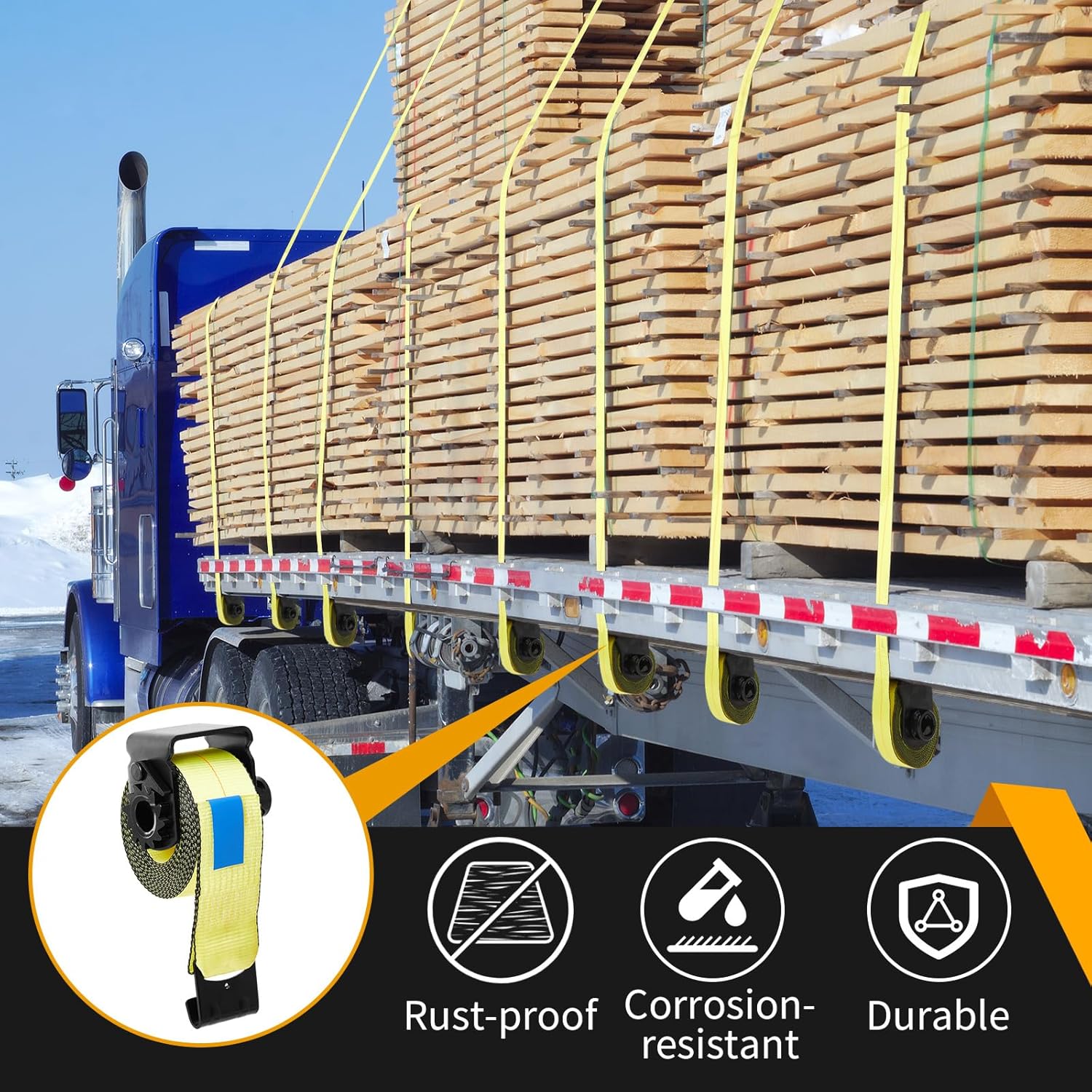 Product Materials: the trailer winch is made of heavy duty steel and painted black for corrosion and rust resistance, ensuring durability; The truck strap tie downs are made of yellow polyester fabric that resists moisture, shrinkage, and stretching, making them durable and resilient to environmental conditions; The coated webbing provides greater stability and reliability than other tie-down materials