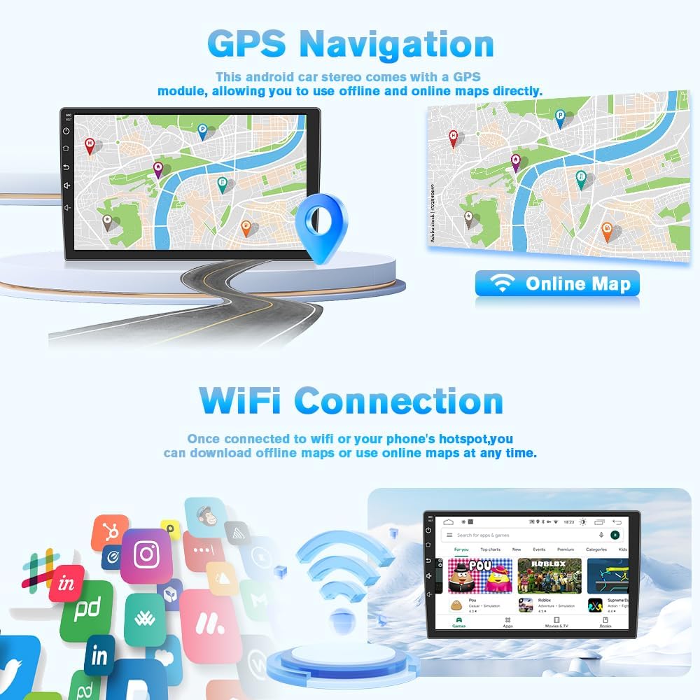Wireless CarPlay & Android AutoA smart way to use your phone in the car, simply connect your iPhone/Android phone to the Android car radio via Bluetooth. Use smart voice assistant or touch the display, you can get directions, make calls, send and receive messages, and enjoy music etc. A smarter, safer and more fun way to use your phone in the car, and keep you stay focused, connected and entertained.
