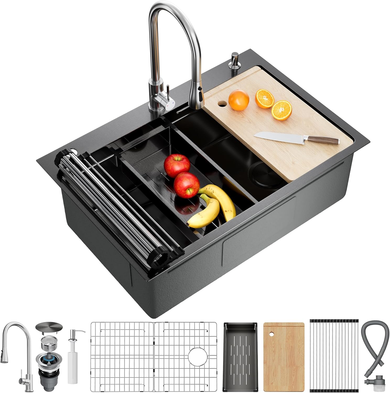 33X22 Drop In Kitchen Sink, Nano 304 Stainless Steel Workstation Sink, Pop-Up Drain, Fast Drain & Anti-Clog