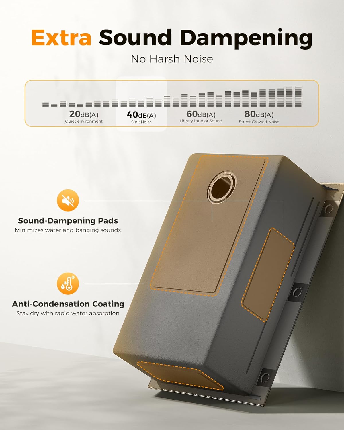 [Quiet sink]The thickened and enlarged sound-dampening pads keeps you away from noise and allows you to enjoy a peaceful kitchen environment. The thick anti-condensation coating is like a heat insulation cover, which can keep the cabinet dry and protect it.