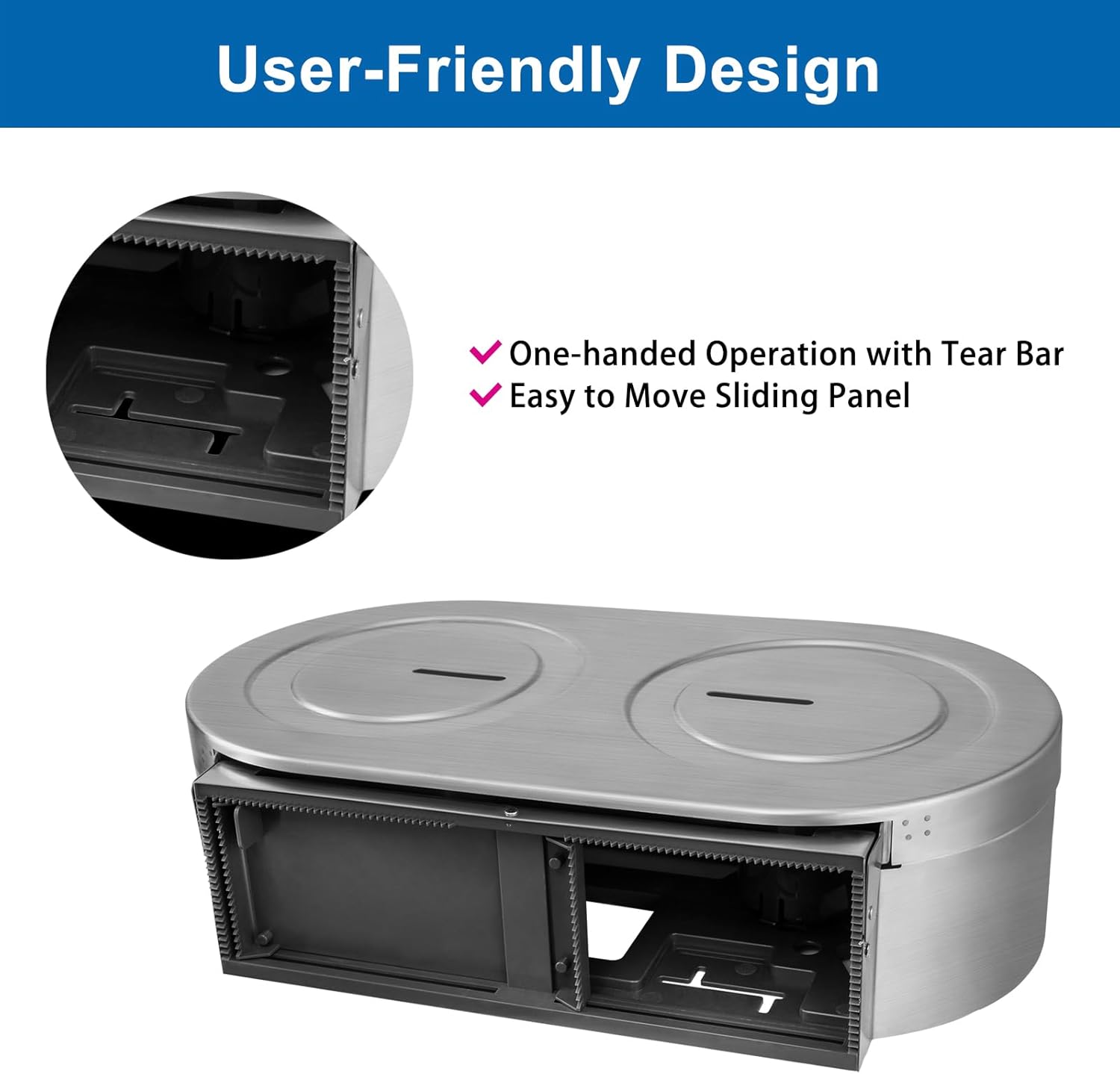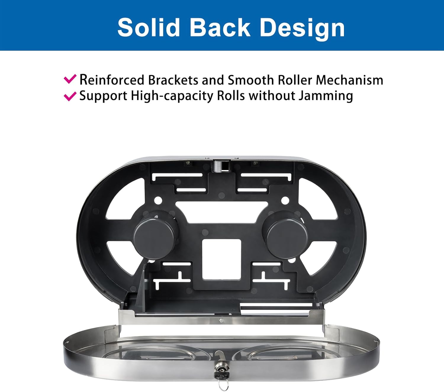 Large Capacity - Holds two jumbo-sized paper rolls (up to 9\' diameter), ensuring continuous supply and reducing downtime for refills, perfect for high-traffic areas, designed to meet ADA standards when properly installed