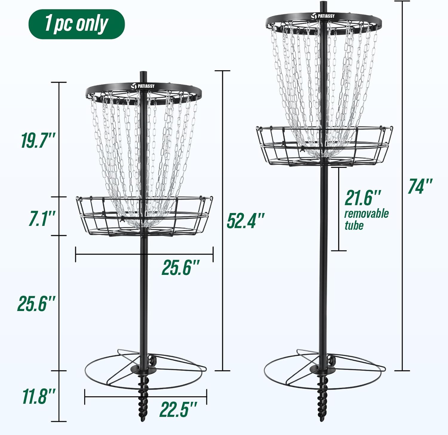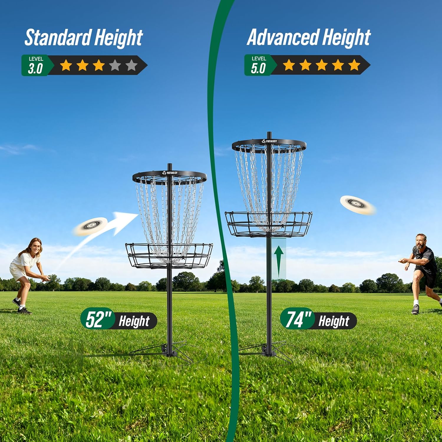 Adjustable Height: This freestanding disc golf basket offers two height options: 52\' for standard practice and 74\' for advanced training. Easily switch between heights to match your skill level and improve your putting accuracy in various conditions