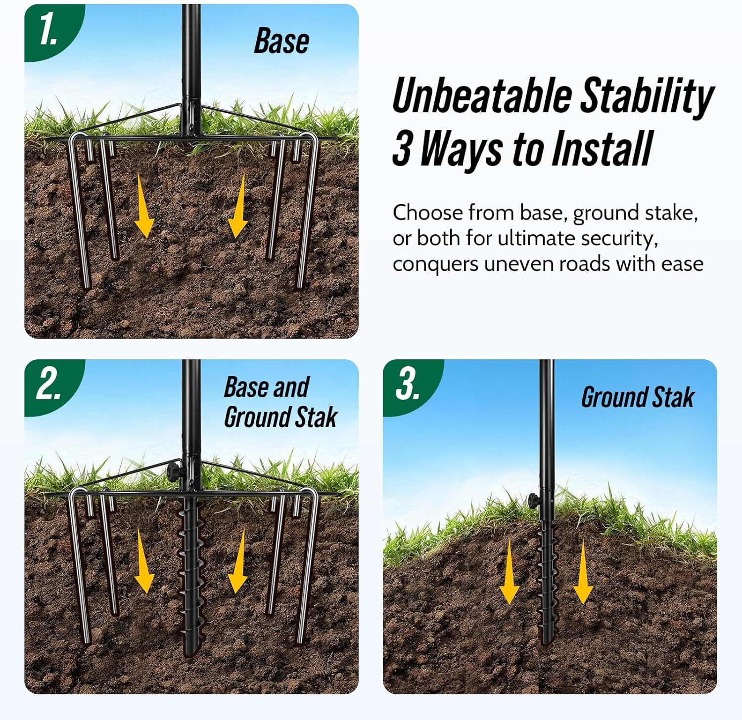 Ground Stake for Stability: Comes with a detachable ground stake and three setup options: base only, base + stake, or stake only. Use base modes on flat ground; the stake-only method provides stability on sloped or rough terrain