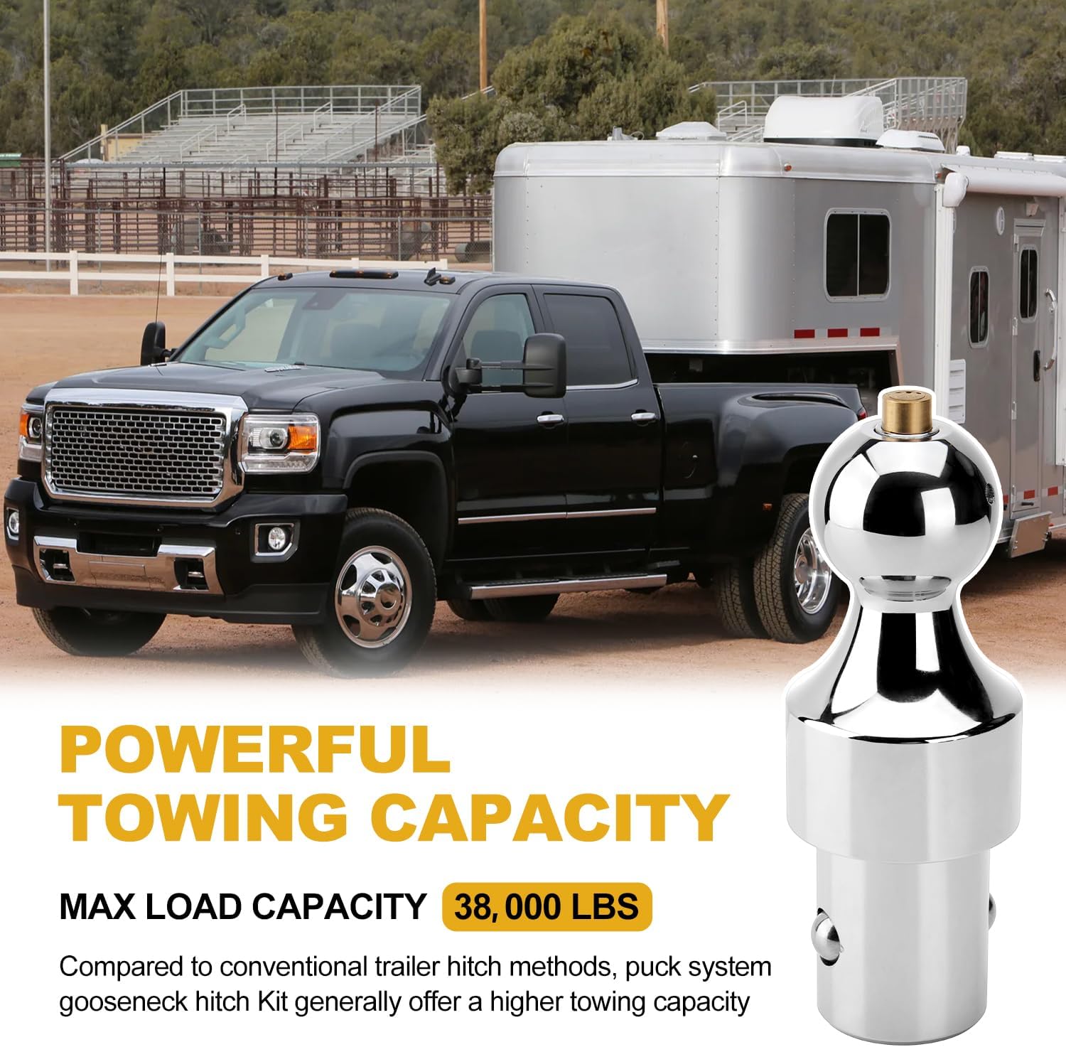 Higher Towing Capacity: 38,000 LBS load capacity; compared to conventional trailer hitch methods, puck system gooseneck hitch Kit generally offer a higher towing capacity, making them an ideal choice for handling large or heavy trailers.