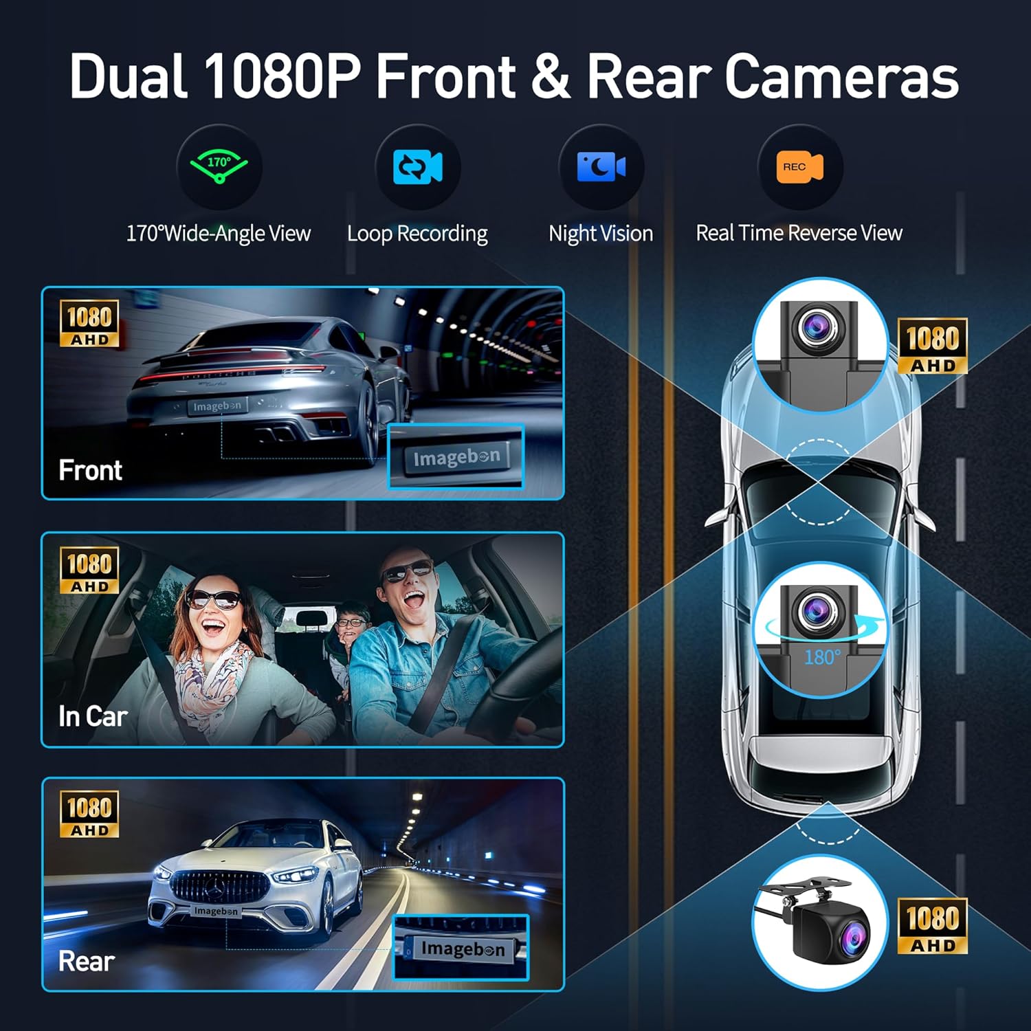 Front & Rear 1080P Cameras with 180° Rotating: Imagebon car play screen with front and rear 1080P cameras provide full road coverage, and the front camera rotates 180° for flexible angle adjustment—perfect for capturing both the road ahead and the car interior. Real-time rear view while reversing makes parking safer by clearly showing obstacles behind your vehicle