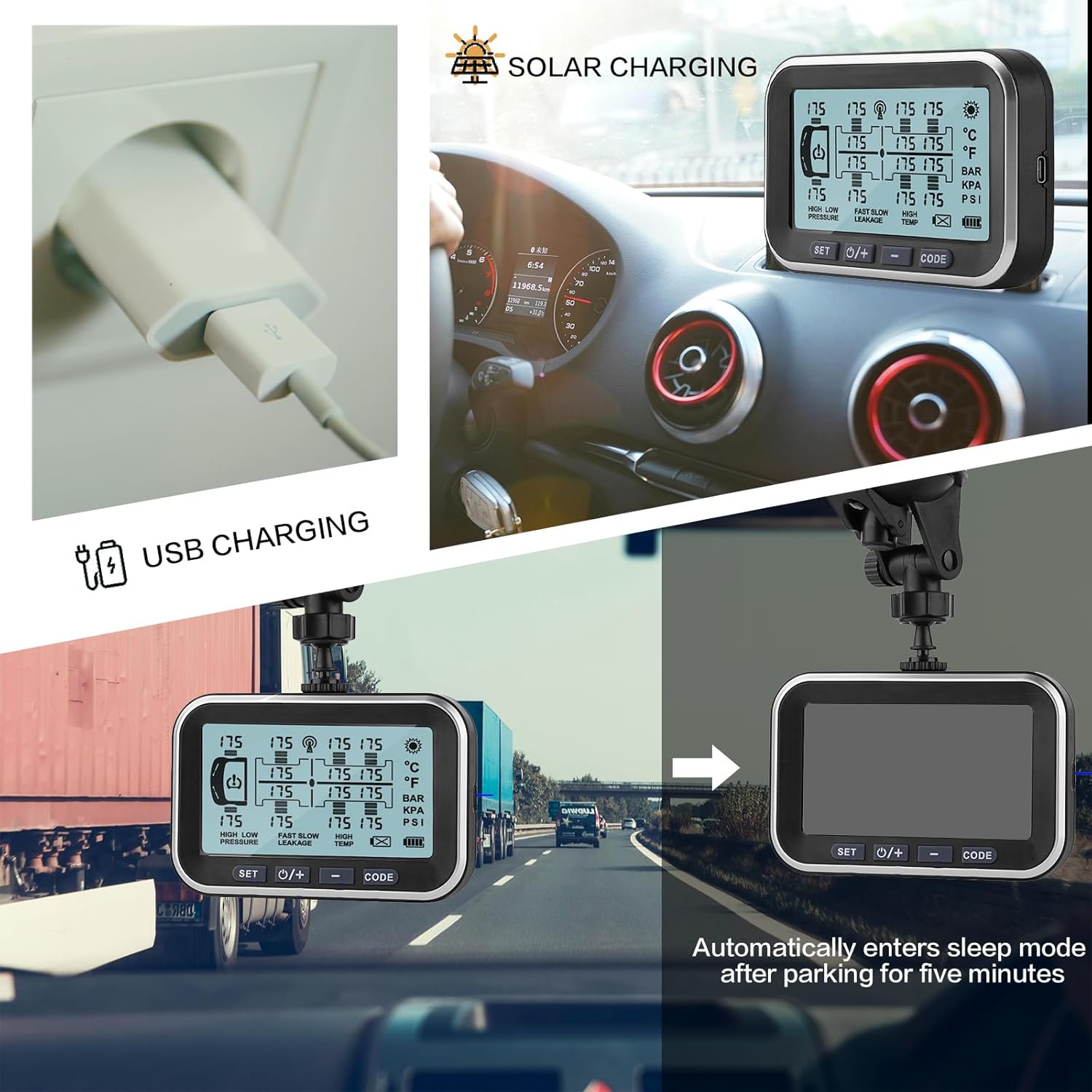 Long-lasting battery life; equipped with automatic sleep mode: Tyona TPMS is equipped with a 4.5-inch display and supports both USB charging and solar charging. A 1.5-hour USB charging gives a battery life of approximately 60 hours. Tyona TPMS also features a five-minute automatic sleep mode and solar charging when parked, for longer battery life in sunny weather.