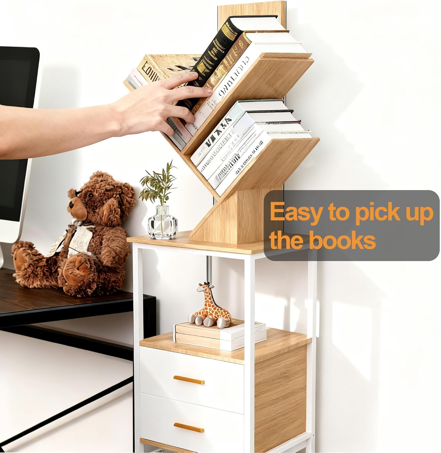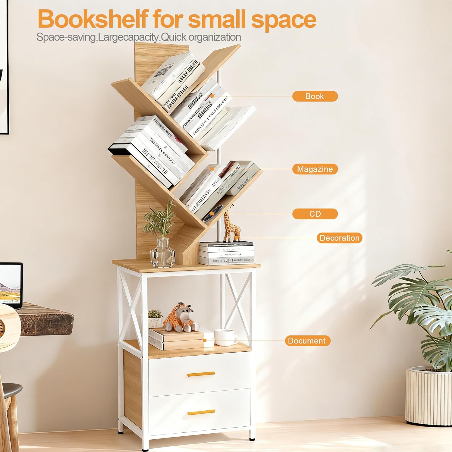 Bookshelf with Double Drawer, 5 Shelf Tree Bookshelf, Wooden Bookshelves Storage Rack, White Drawer