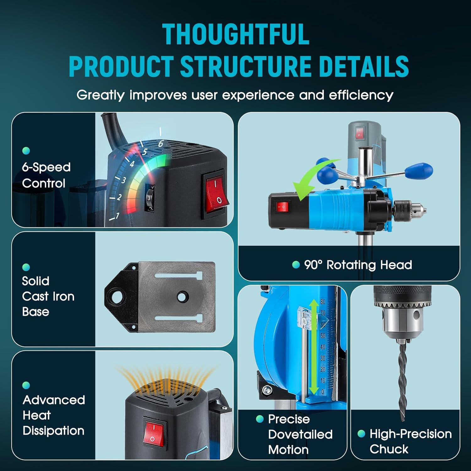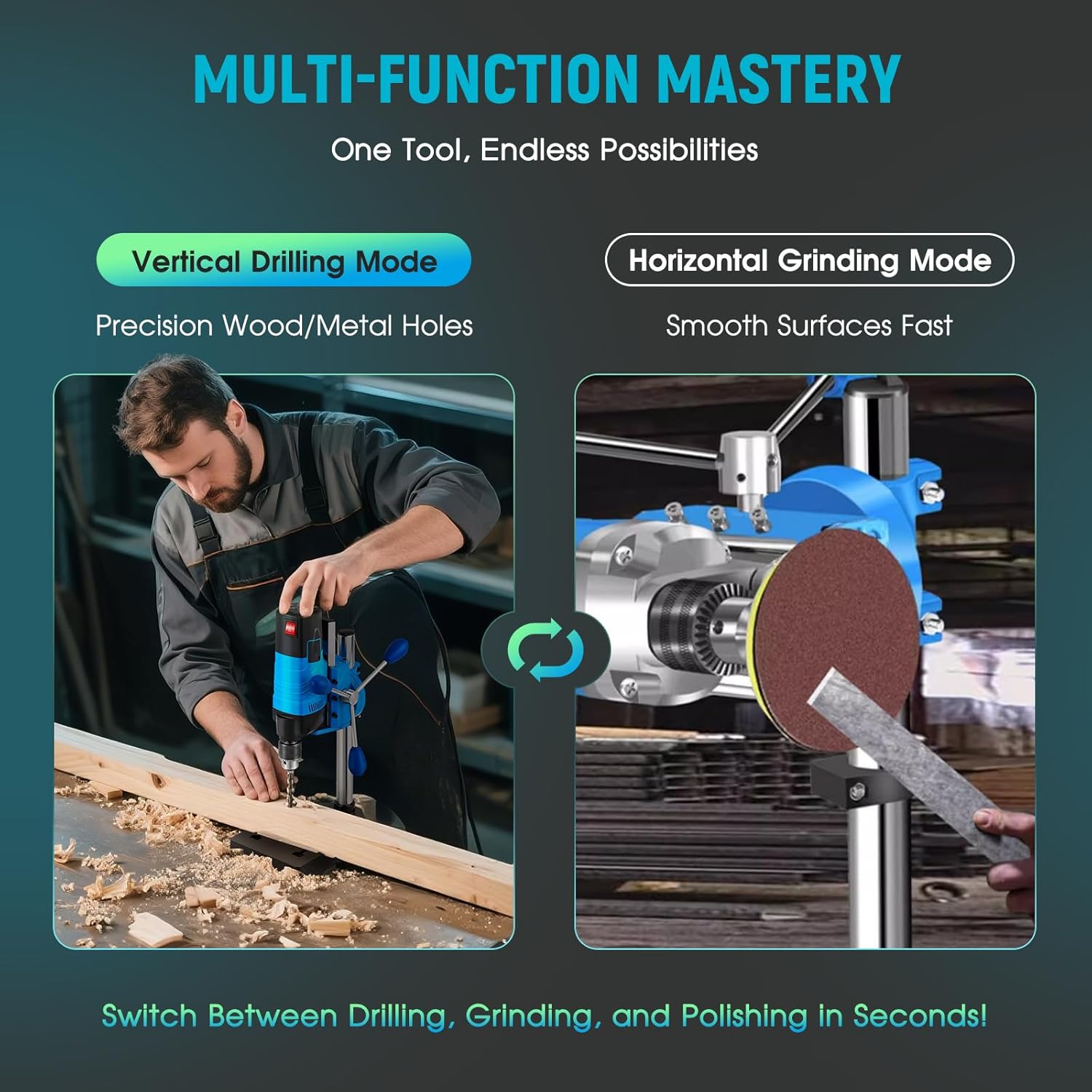 Instantly Switch from Drilling to Grinding: Rotate the drill head 90° in seconds (grinding wheel sold separately). No more swapping tools – seamlessly handle metal deburring, sharpening, or precision drilling in one compact workstation. Maximize workspace efficiency with dual functionality