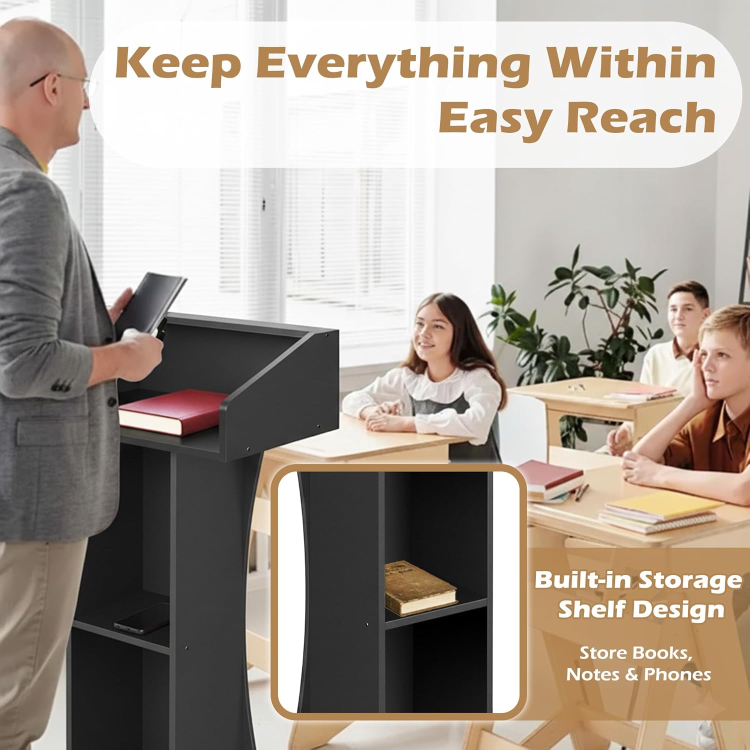 Spacious Presentation SurfaceThe large top platform provides ample space for a laptop, tablet, notes, or microphone setup. A raised edge keeps your items secure while you present, making it ideal for lectures, sermons, or corporate meetings.