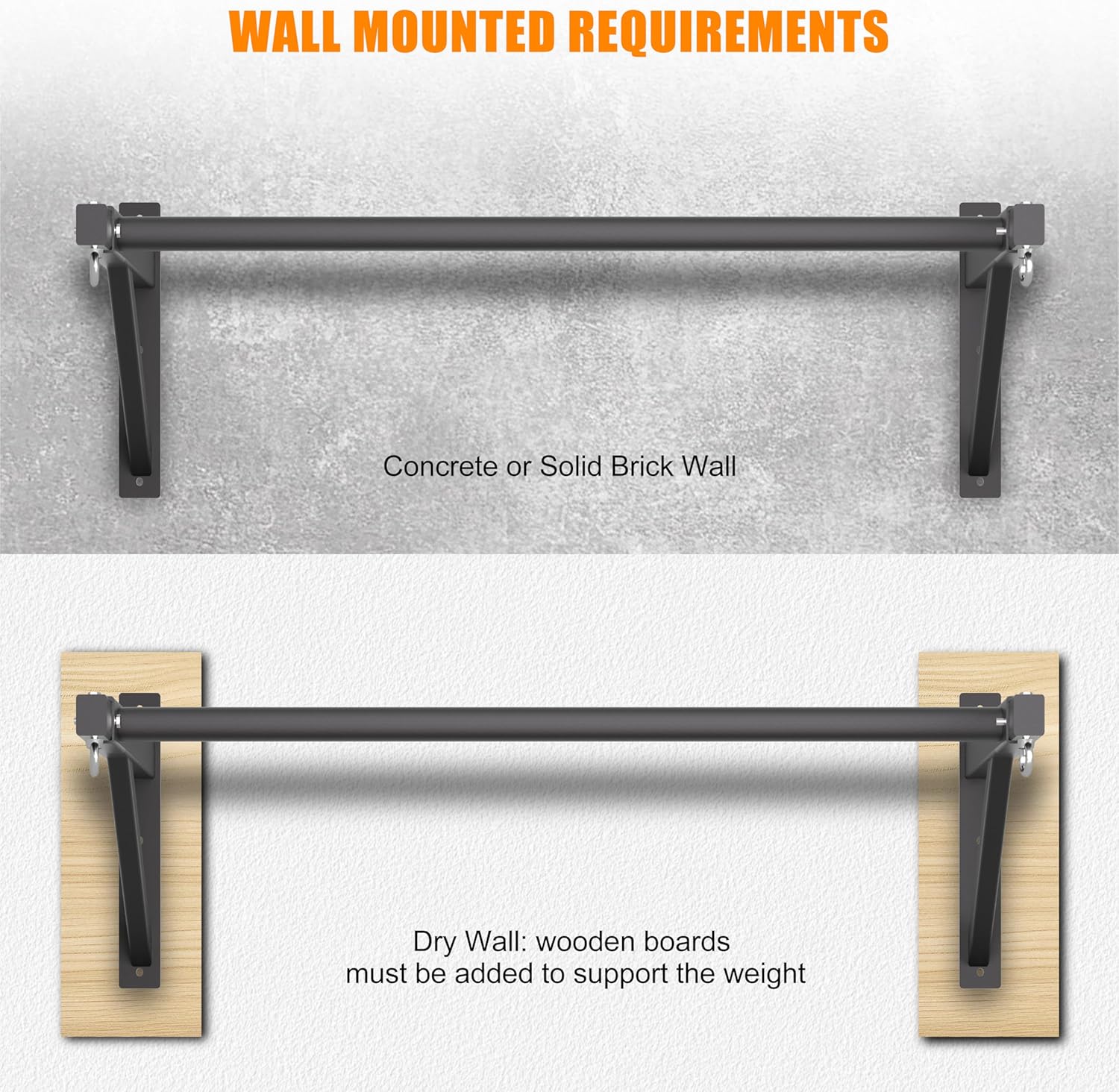 EASY TO INSTALLThis wall mounted chin up bar has a mounting hole spacing is 48\' wide and can be mounted on 24\' & 16\' concrete, solid brick walls or support timbers, all mounting accessories and installation instructions are included in the package for easy installation.