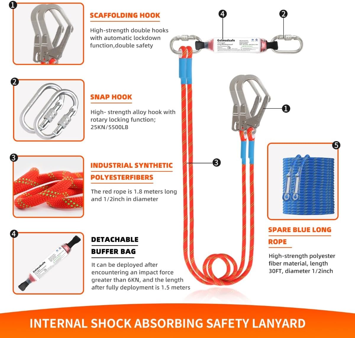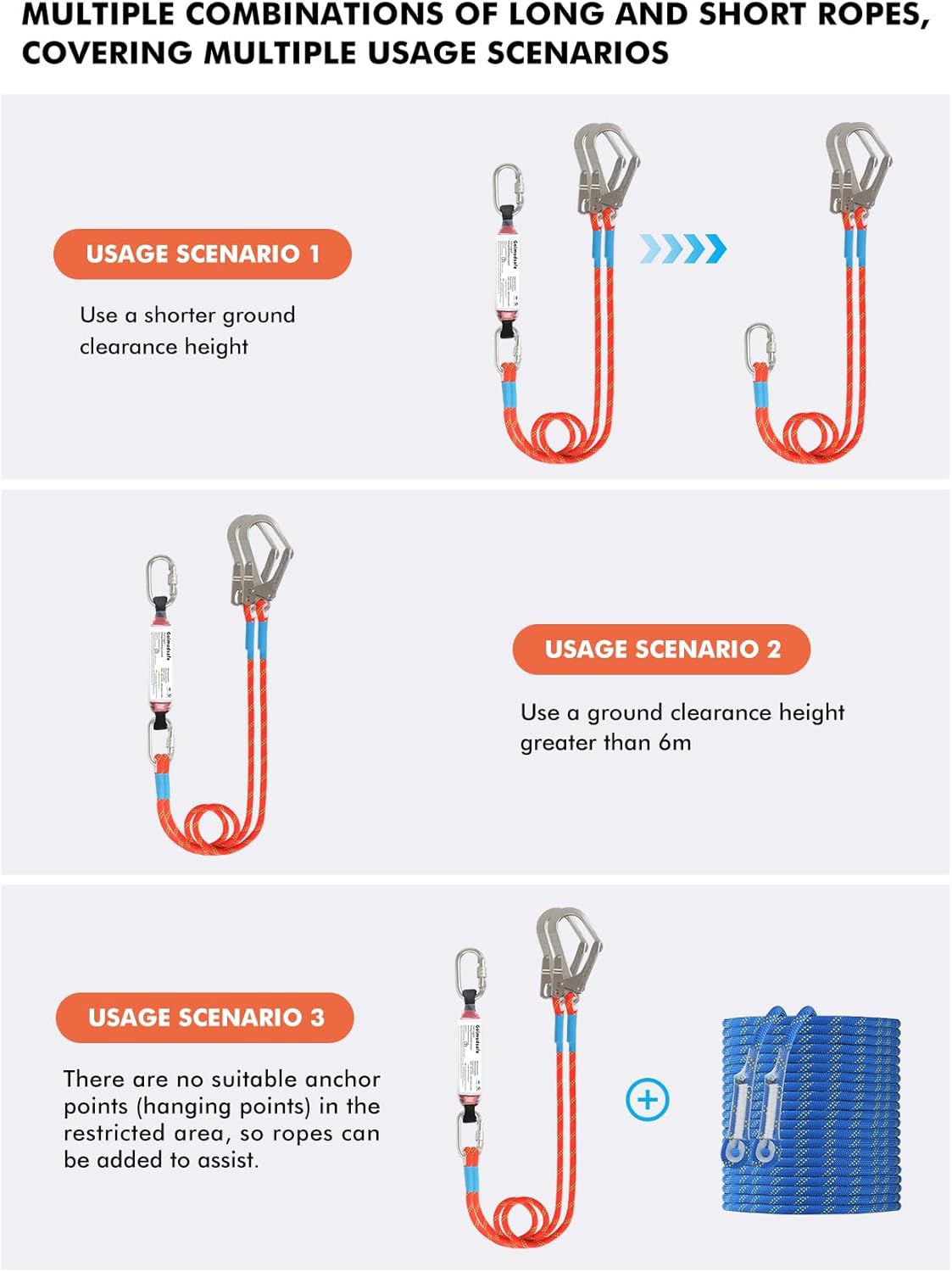 Multi-Scenario Application1Close-Range Use – Unclip the carabiner and remove the shock absorber pack to prevent unintended deployment during short-distance tasks. 2.High-Altitude Protection (6m+) – Standard shock pack activates upon falls (>6KN force), absorbing impact to minimize bodily injury. 3.Long-Distance Anchor Setup – For remote anchor points (roofing, climbing), pair with our 30FT rope for easy deployment.