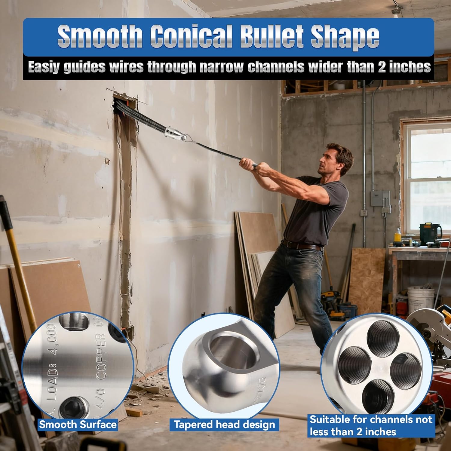 Convenient Operation: Wire puller tool with smooth surface and tapered bullet nose help guide wires through narrow channels. Suitable for pipes 2 inches or larger. No tape, no crimping, no mess
