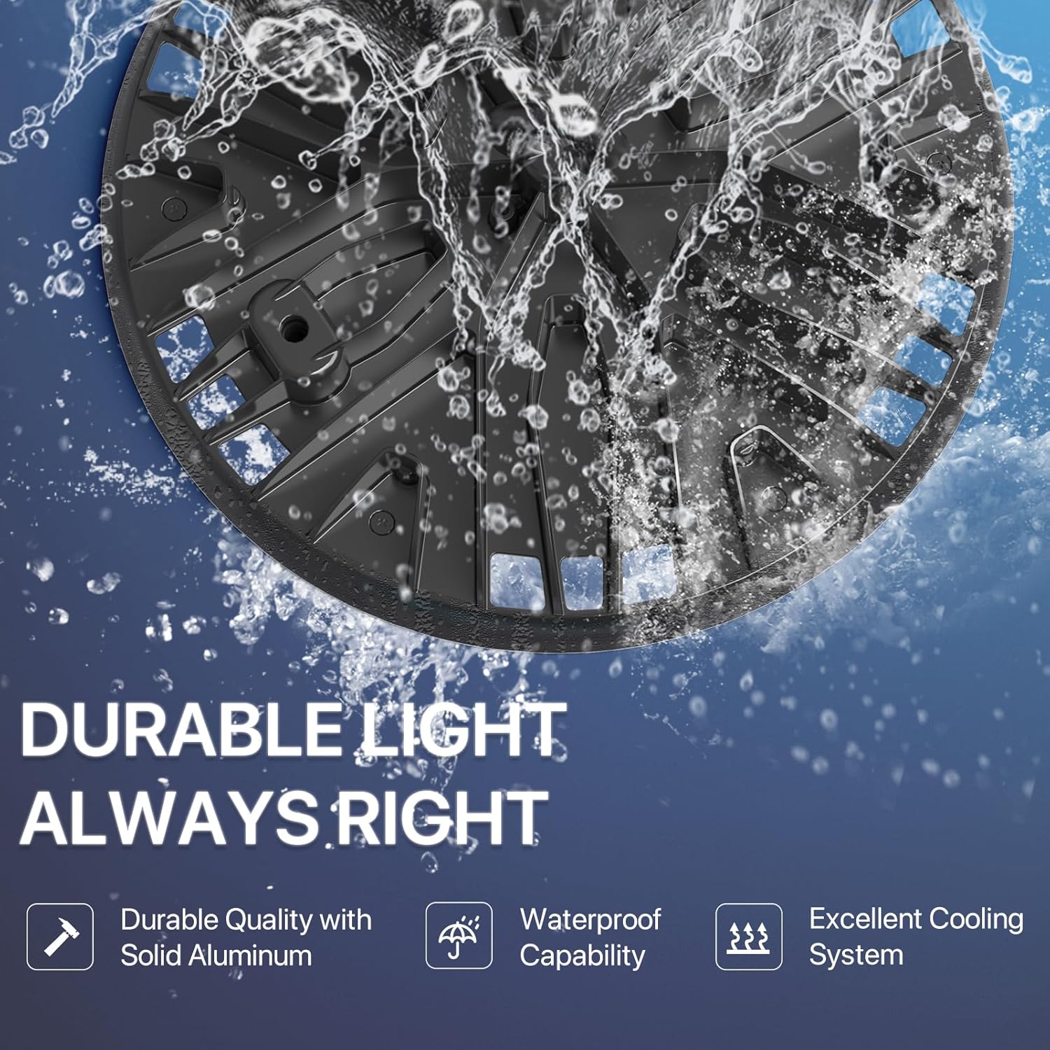 COMMERCIAL-GRADE: HYPERLITE UFO lights replace outdated HID&HPS fixtures with resilient and durable illumination. Shatter-resistant aluminum housing. UL certified. IP65 waterproof rating ensures reliable, bright light in any weather.