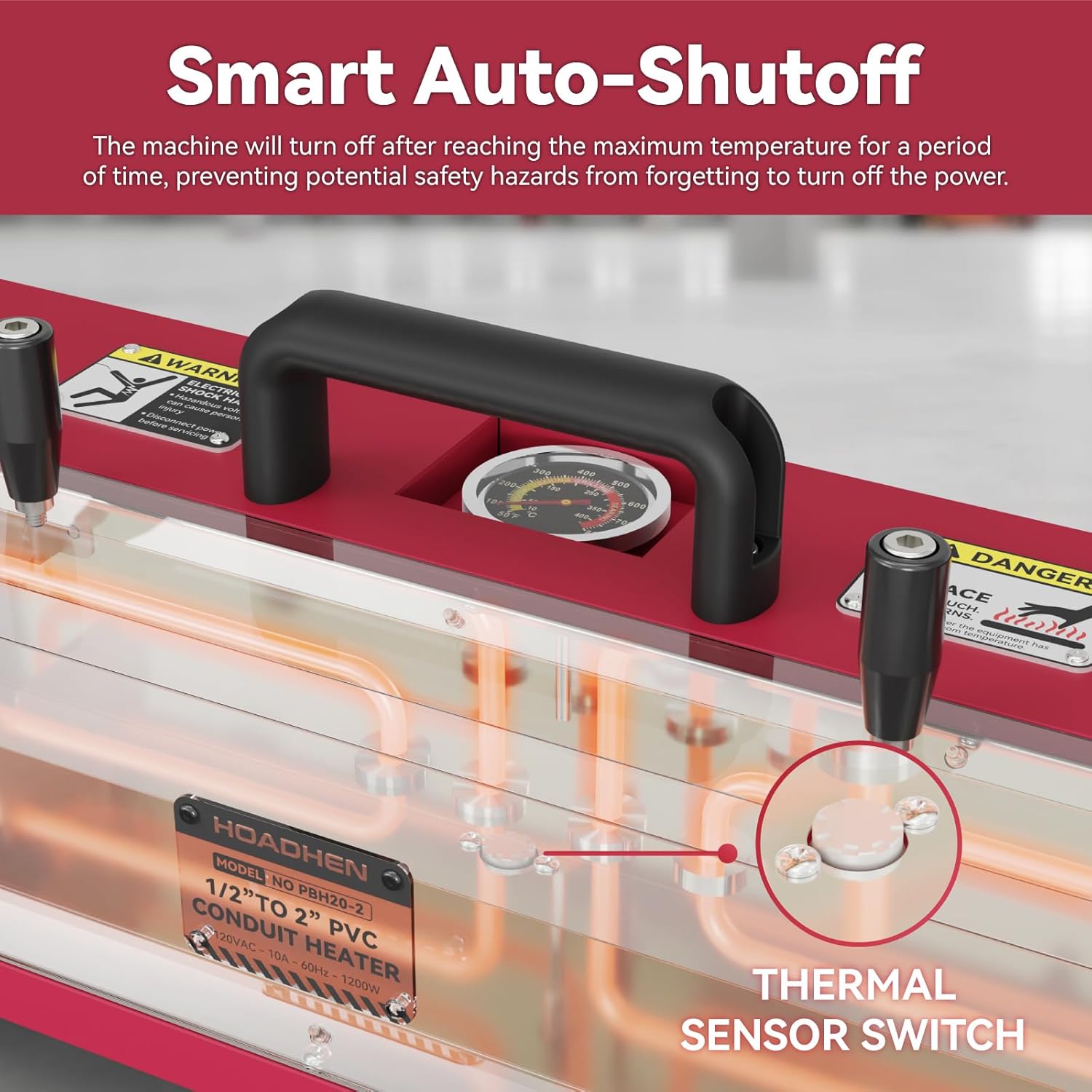 Safety Protection: To ensure safe operation, the pvc conduit bender is equipped with an automatic shutoff feature. If the internal temperature exceeds 500°F and remains for 7-10 minutes, the pvc conduit heater will automatically turn off, preventing potential hazards. Additionally, the switch is designed with an indicator light, allowing you to easily monitor the heater`s status, ensuring safe operation at all times.