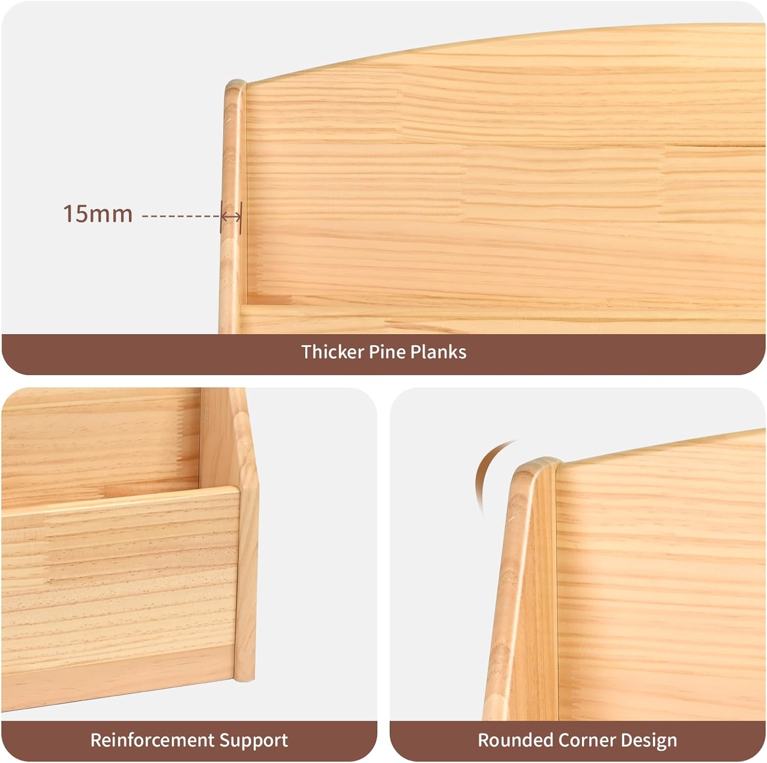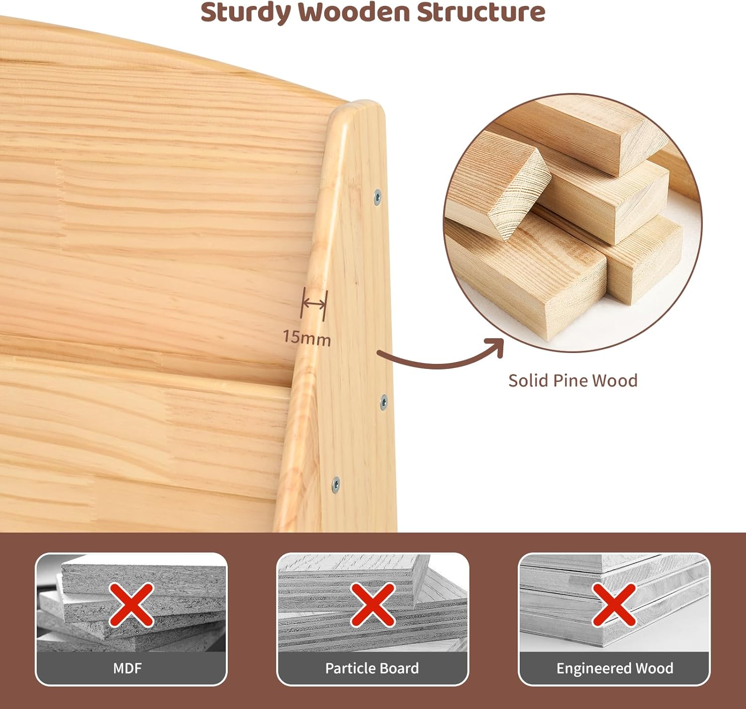 STURDY AND SAFE STRUCTURE: Crafted from premium, odorless pine wood, The triangular wooden structure keeps the kids bookshelf stable and protects it from toppling over. Durability meets innovation—our wood surface uses the same advanced UV technology found in dental fillings for long-lasting beauty and safety