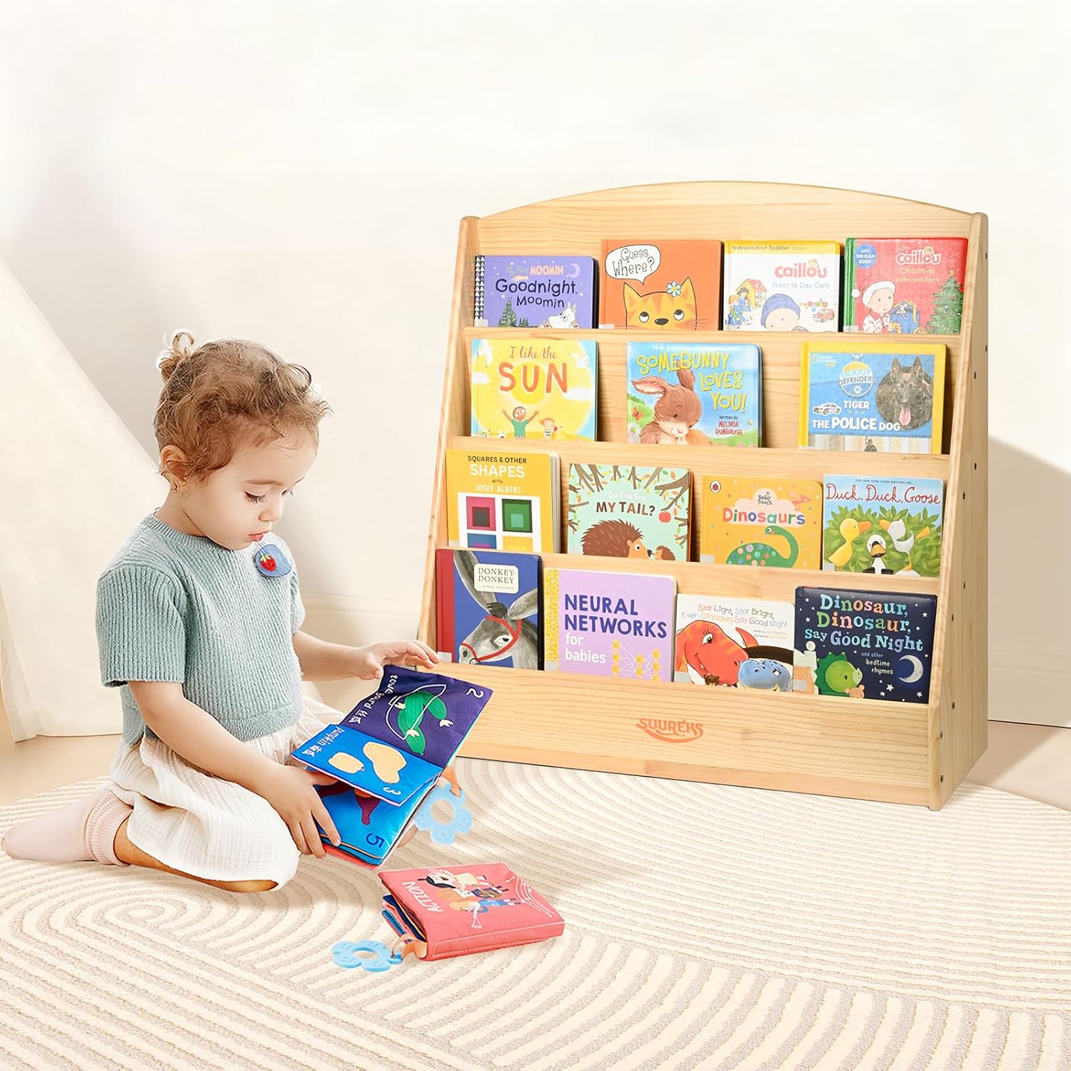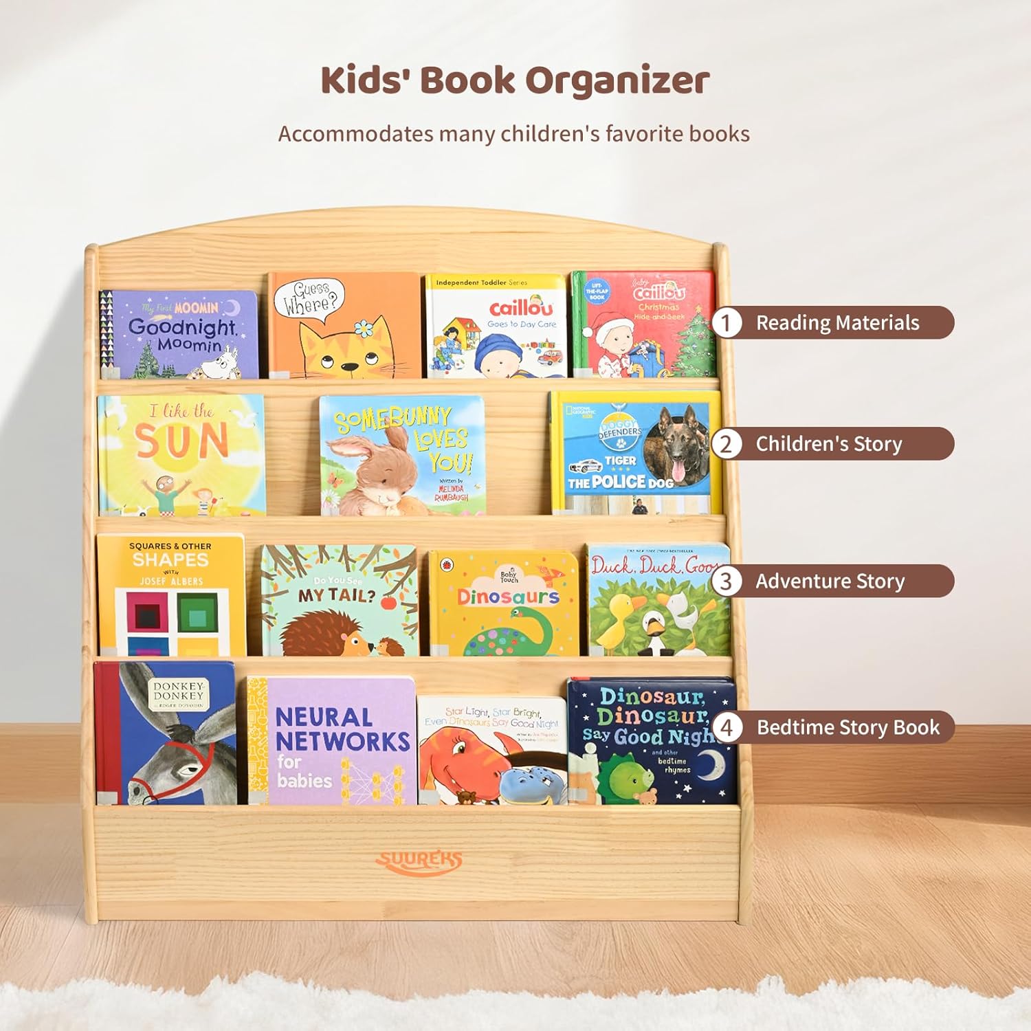 AMPLE STORAGE SPACE: Featuring four spacious tiers, this wooden bookshelf provides ample space to neatly arrange and display a child`s favorite books. By showcasing the book covers, it enables children to easily organize and access books easy, empowering children to help themselves and fostering their independence