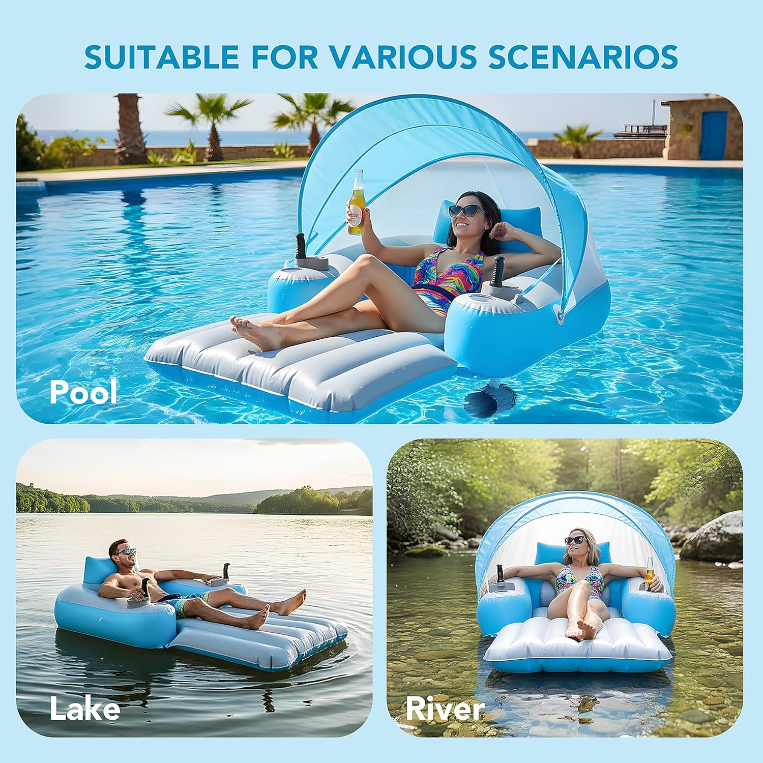 All-Day Relaxation:Float in total comfort under the foldable SPF 50+ sun canopy, offering full protection from intense rays. Removable design gives you flexible shade control. Combined with the ergonomic 135° reclining backrest, this lounger lets you relax for hours without leaving the water