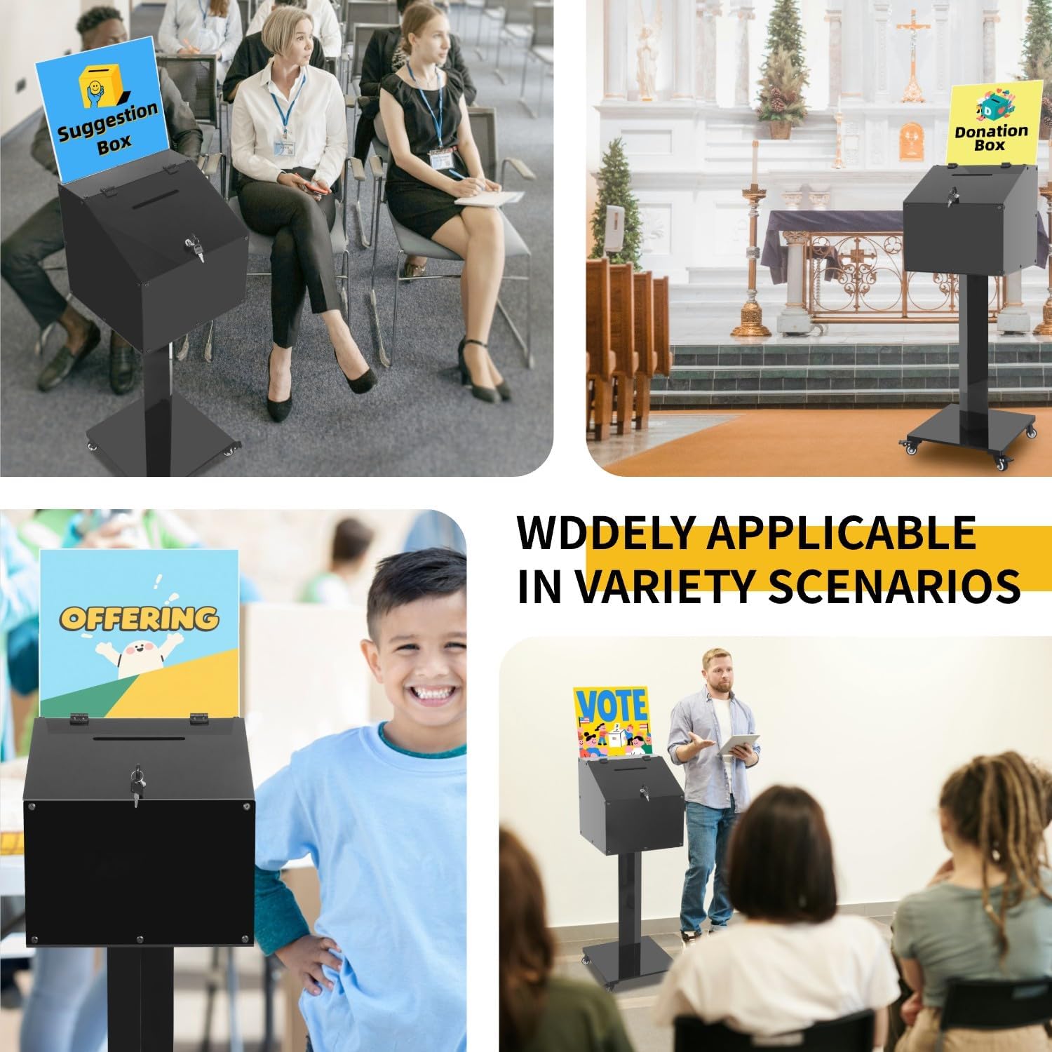 Stable and Freestanding: The acrylic donation suggestion box`s wide, sturdy base (38 5/6\' height) ensures that it stands upright and remains stable, without the need for wall mounting or extra support