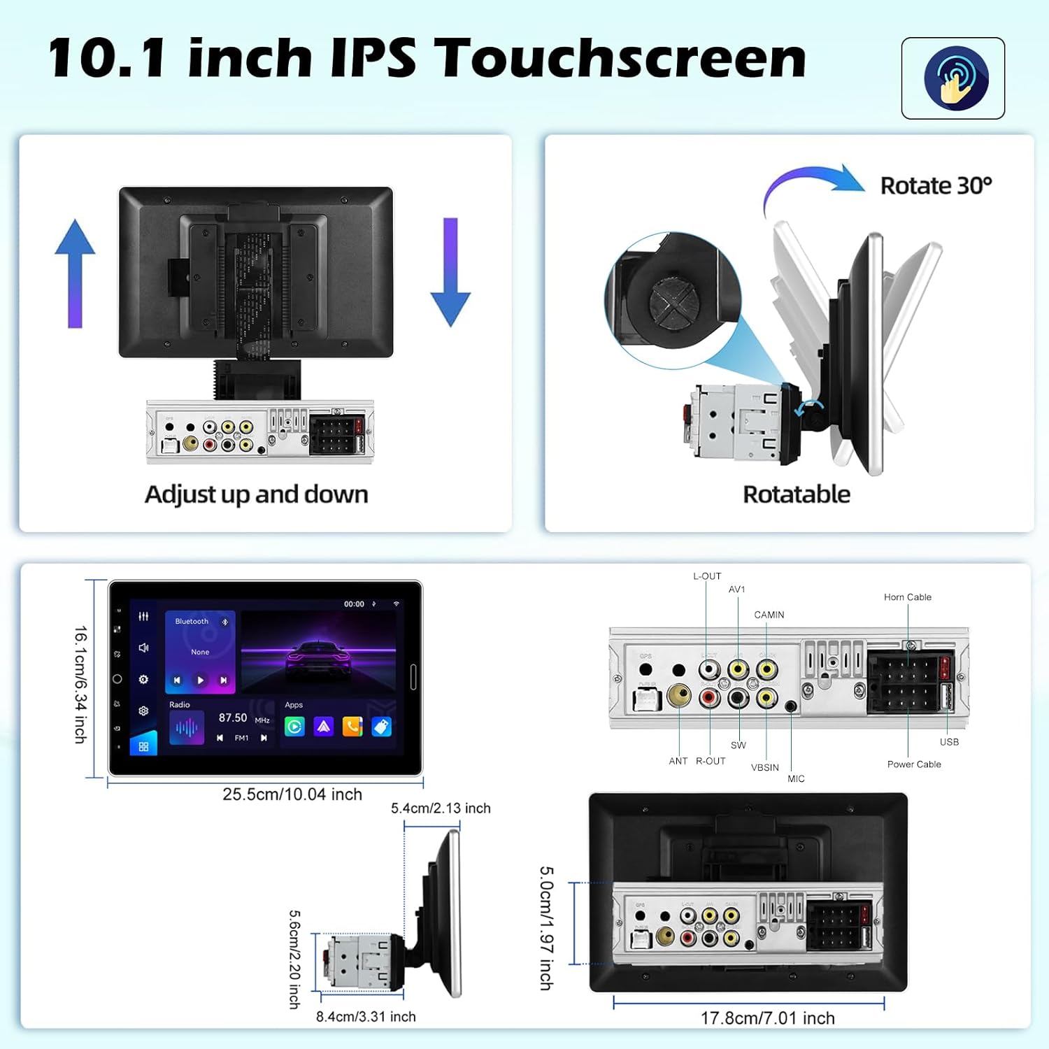 10.1 inch IPS Touchscreen & Support YouTube VideoSupport online viewing of You-Tube, enjoy high-definition videos and exciting content. the single din touchscreen radio equipped 10 inch IPS rotatable 1080P HD screen, can be adjusted up and down and the front and rear adjustment range is 30°. The installation size: 178 mm*50 mm (7.0*1.97 inches)