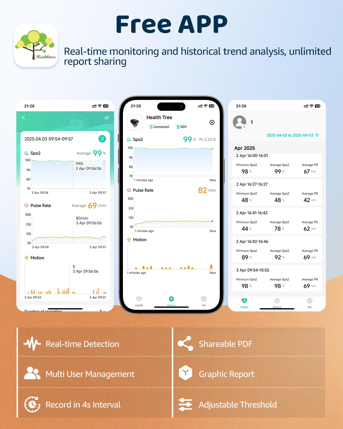 Detailed APP reports: Free APP provide graphical blood oxygen, pulse rate and trend chart reports. PDF and image format reports can be shared unlimitedly. O2 pulse oximeter finger APP allows you easily share all-day data and trends, or view real-time blood oxygen levels and heart rate on your phone, tablet.