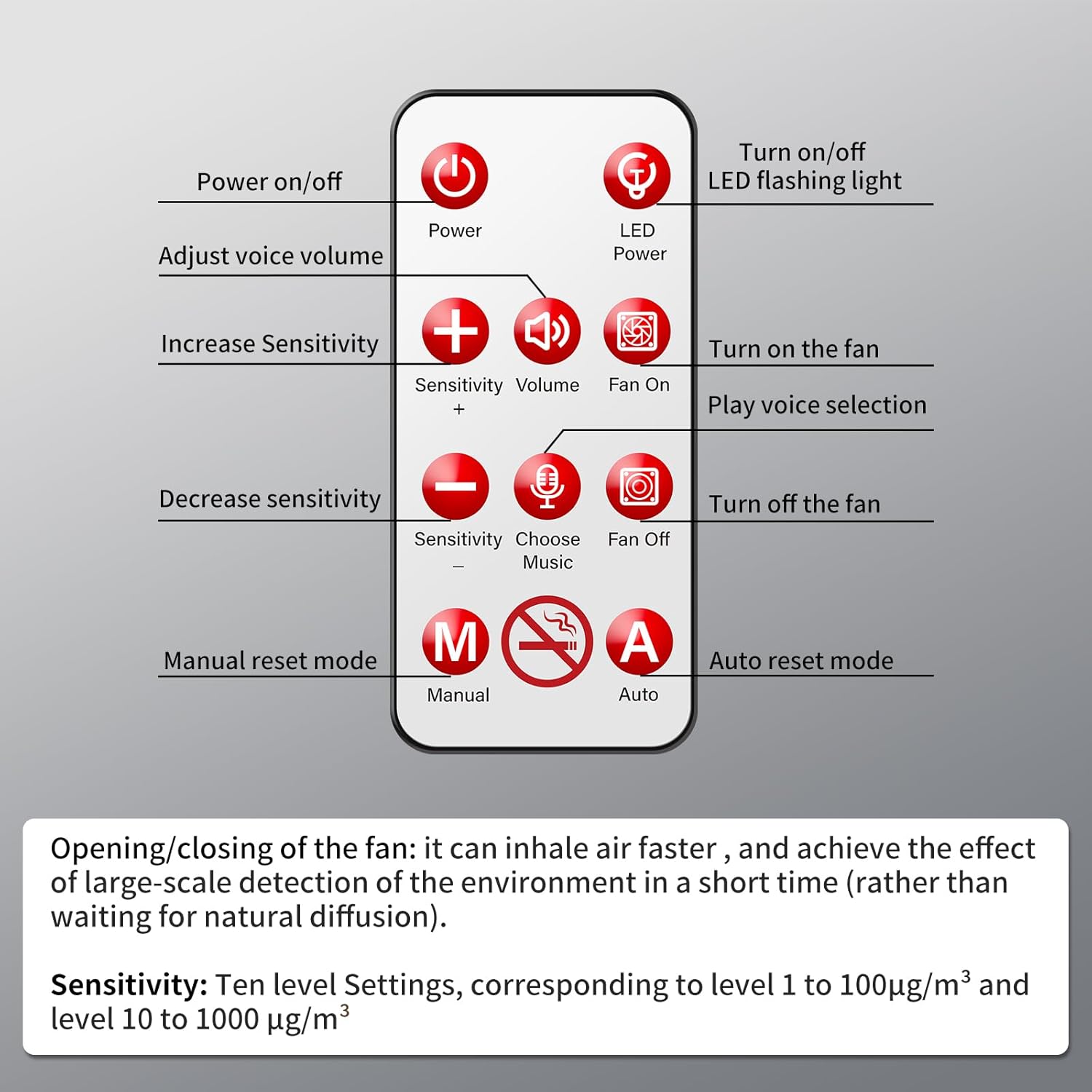 10-Level Sensitivity AdjustmentThe sensitivity of the cigarette smoke detector can be achieved by pressing the buttons \'+\' and \'-\' on the remote control.Easily adjust the 10-level sensitivity to perfectly match your environment.Universal OccasionCigarette smoke detectors are suitable for various non-smoking places. Such as schools, hospitals, offices, apartments, corridors, and so on.
