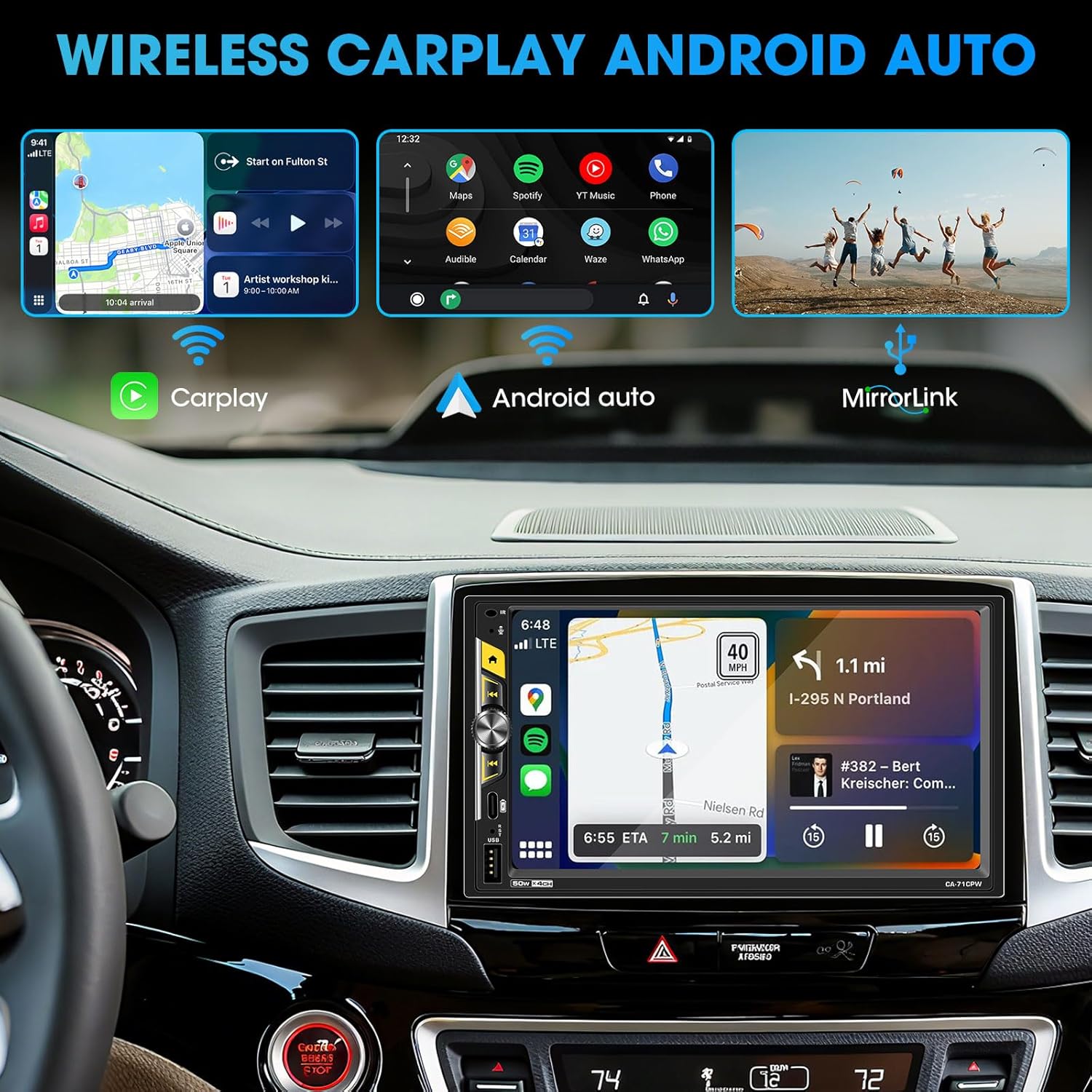 Double Din Car Stereo Receiver, 7 Inch Wireless CarPlay Android Auto Touchscreen, Backup Camera