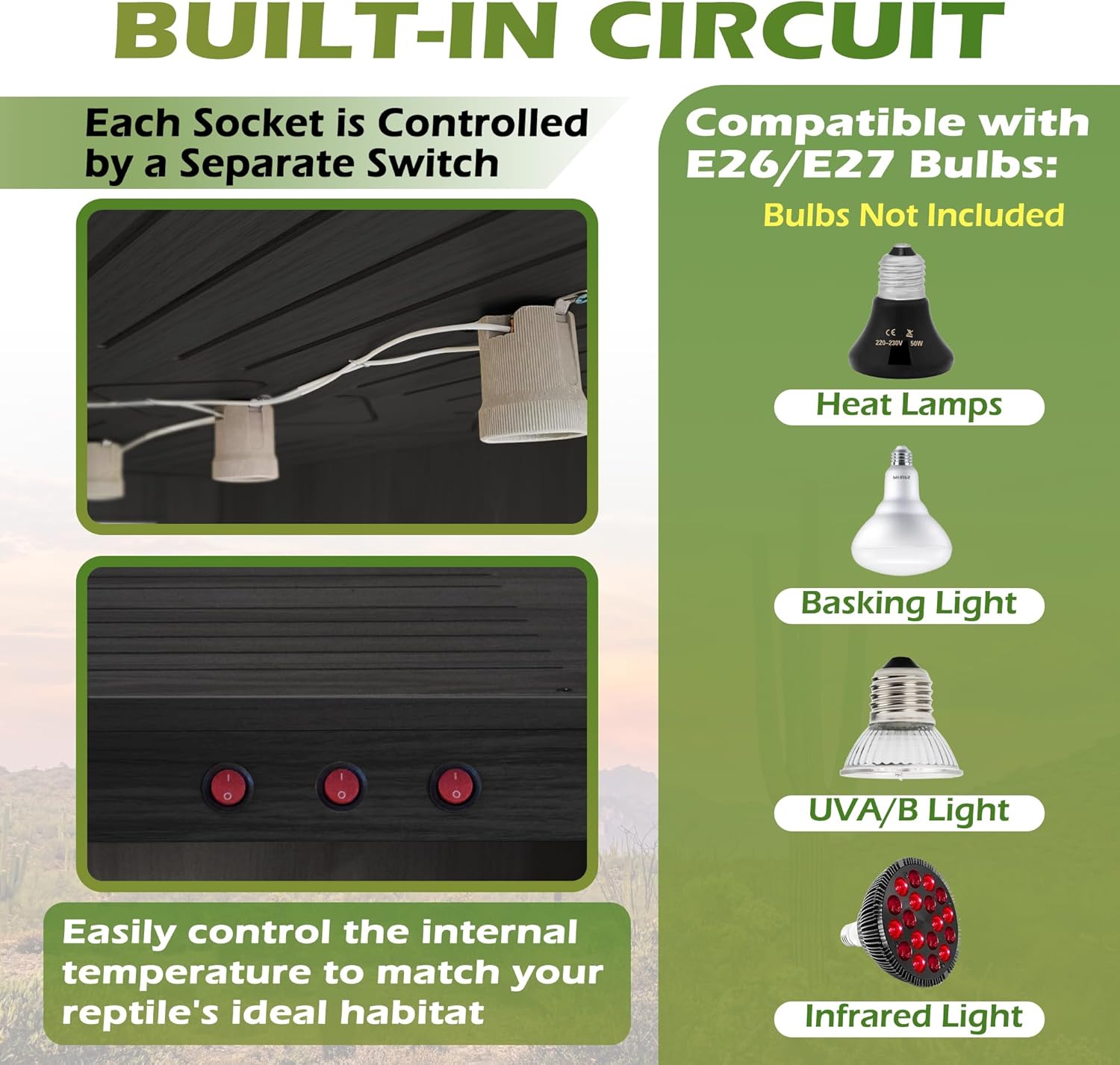 Built-In Lighting SystemThe integrated electrical system includes built-in lamp holders—2 holders for 24\'/32\' models and 3 for 40\'/48\' models—each equipped with its own independent switch, saves money setting up the light fixture. Compatible with standard E26/E27 bulbs (not included), this setup gives you full control over lighting and temperature to create the perfect environment for your reptile`s specific needs, and say goodbye to tangled wires, one wire control the whole cage.