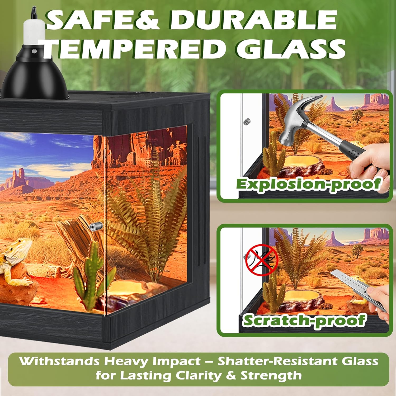 Durable Build & Premium MaterialsBuilt to last, this reptile terrarium is crafted from sturdy tempered glass and natural wood with a waterproof coating for long-term use. The durable construction combines modern aesthetics with practical protection—featuring a waterproof acrylic base panel that shields against spills and moisture to keep the habitat clean, dry, and well-maintained.