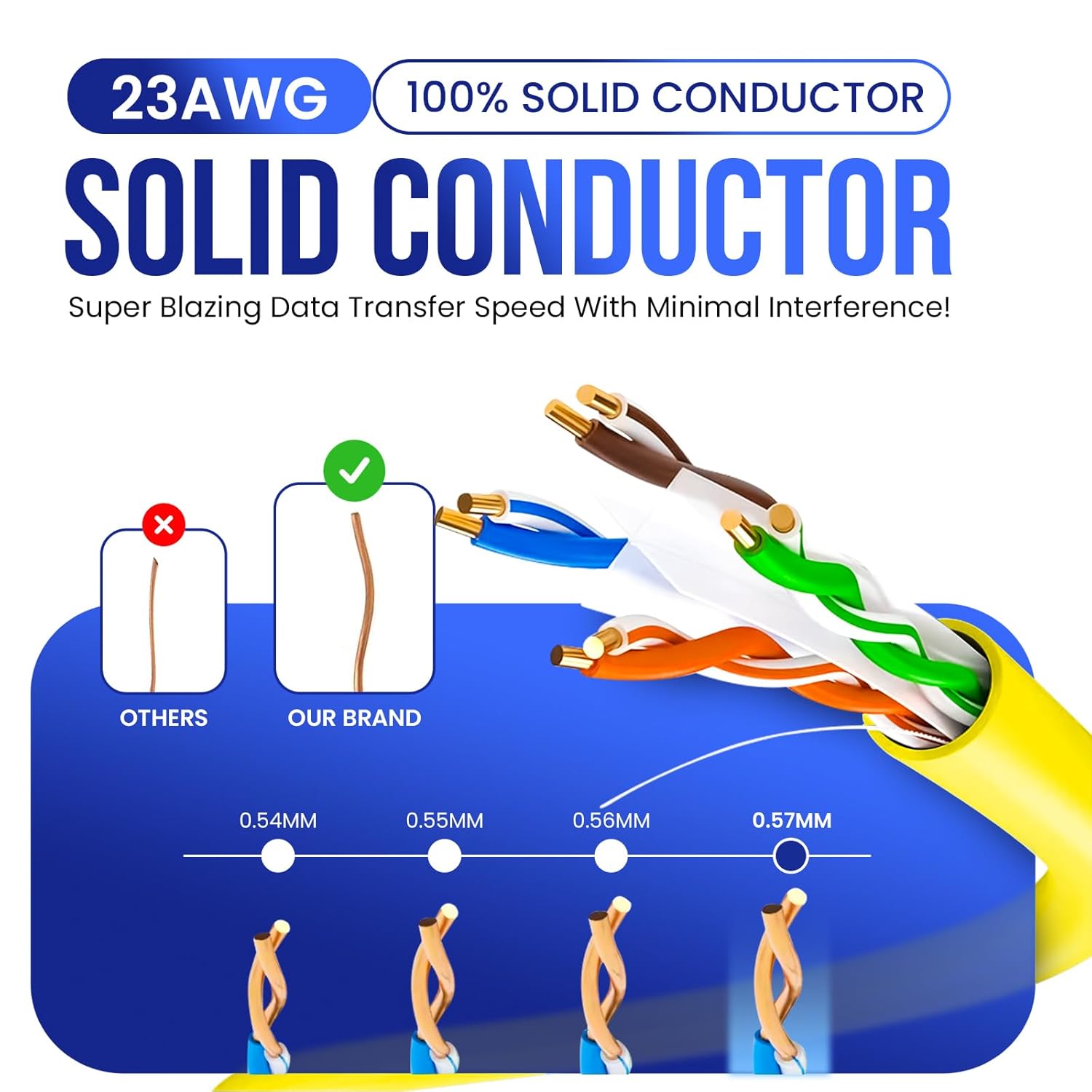 : This blue Cat 6 Ethernet cable is constructed with premium 23 AWG Ethernet cable featuring 100% solid conductors. It guarantees exceptional signal quality and maximum conductivity. Our bulk Cat6 plenum cable minimizes signal loss over extended distances, ensuring superior bandwidth and enhanced durability.